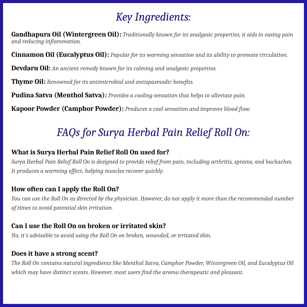 Experience instant relief from aches and pains with Surya Herbal Pain Relief Roll On. Infused with natural ingredients known for their therapeutic properties this roll-on quickly alleviates discomfort and soothes muscles.