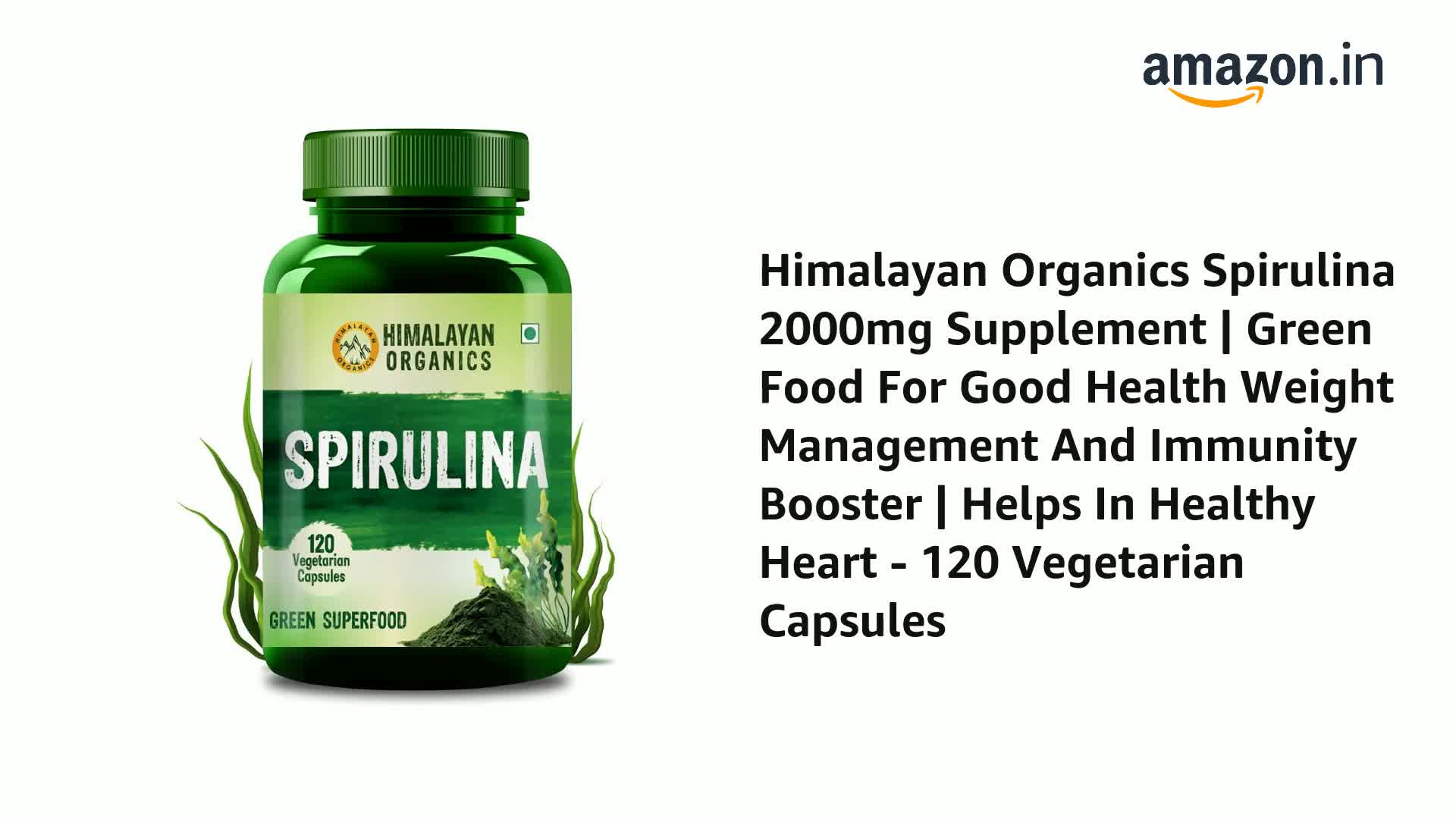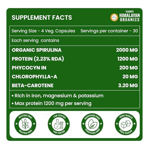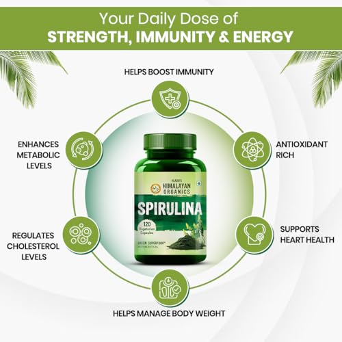 • GREEN FOOD FOR GREEN HEALTH: HIMALAYAN ORganics Spirulina Caps. is a green superfood for green health. Rich in vitamins minerand antiSpirulina promotes overall well-being as it regulates & levels manages s energy levels enhances endurance strengthens musc
