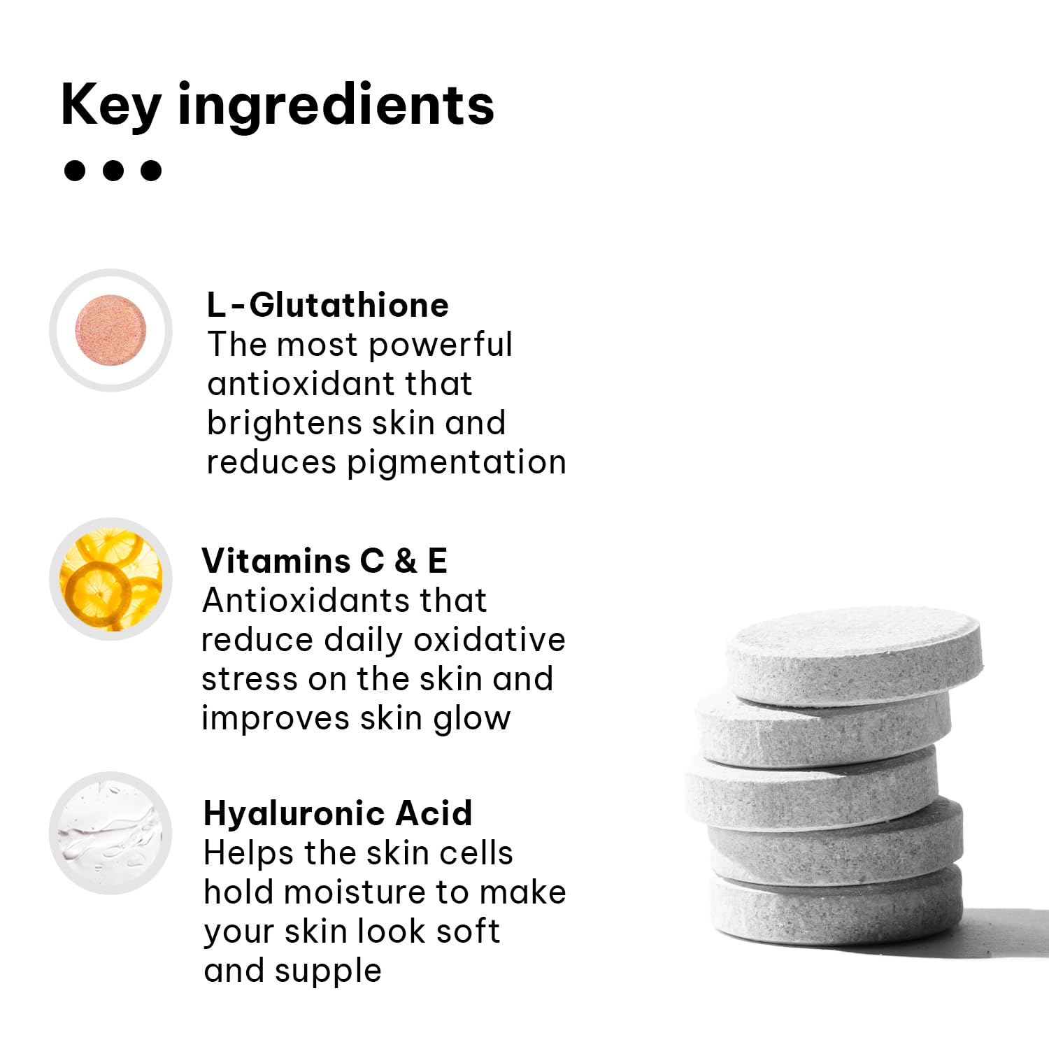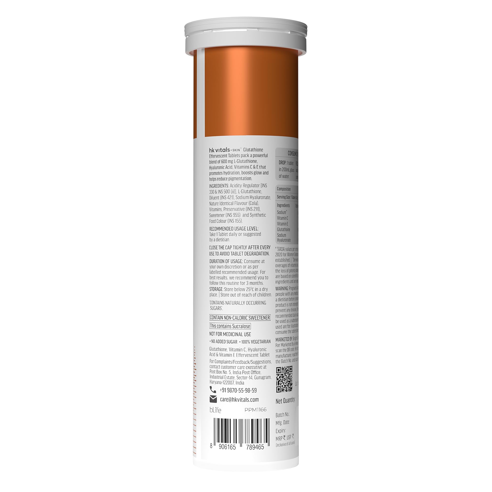 Introducing hk vitals Glutathione Effervescent fizzy tablets that deliver a powerful blend of 600mg L-Glutathione Vitamin C & E. L-Glutathione is a powerful antioxidant which along with Vitamin C & E helps reduce skin dullness and promotes skin glow. Glutathione also helps reduce pigmentation and dark spots by regulating melanin production. One glutathione tablet daily will help improve your skin glow & reduce pigmentation.