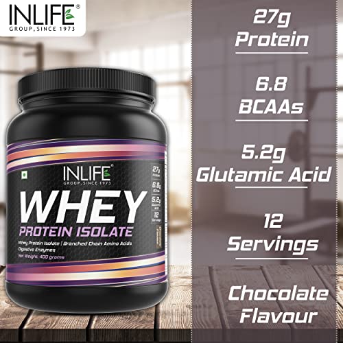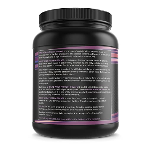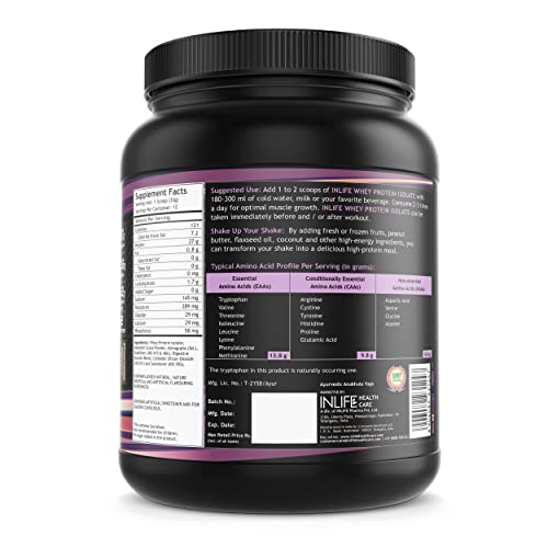 QUALITY PROTEIN: INLIFE 100% Whey Protein Isolate your muscles absorb the protein very fast it's the best kind of whey protein powder if you want to improve body composition. It has whopping 27 grams protein for every 33 grams (1 scoop) of serving ideal for protein synthesis and building muscle. Its high in BCAA's and EAAS they help to protect your muscles increase muscle mass resistance and help with your overall hormonal environment.PACKED WITH DIGESTIVE ENZYMES: Not only is INLIFE 100% Isolate Whey Protein is full of Quality protein but it also has the added benefit of digestive enzymes to help you get the most out of each scoop and puts the Quality protein to work quickly and efficiently. AMAZING TASTE PROFILE: INLIFE Whey is formulated not only for an amazing taste but it also mixes easily and smoothly in your drink of choice. No chunks great flavour no stomach bloating. Nothing but Quality protein powder to fuel your muscles and a taste you will look forward to every time. Quality MUSCLE FOOD: INLIFE Whey is fast absorbing and has a clean profile to help you reach your nutrition and fitness goals. If you are packing on weight or cutting calories INLIFE Whey protein isolate powder is the protein powder that can get you there. Available in 2 sizes: 400 gm and 1kg. SHARE: Consider ordering one bottle for yourself and another for a friend or loved one. Keep each other motivated and reach your goals together and more quickly. INLIFE Healthcare stands by every quality product they make. We manufacture only premium and extra pure but high potency vitamins capsules tablets powders multivitamins herbal supplements and natural herbal skin & personal care products for men women and children. Check INLIFE Healthcare out today!