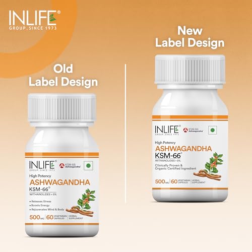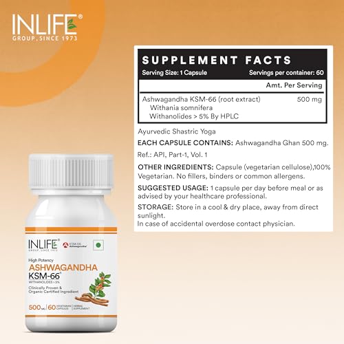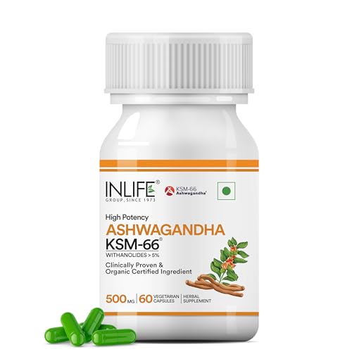 Inlife Ashwagandha KSM-66 capsules deliver a high-quality Ashwagandha root extract known for its potency and purity. Standardized to contain more than 5% Withanolides these Ashwagandha capsules are a natural and effective addition to your daily routine. Encapsulated with HPMC (Hydroxypropyl Methylcellulose) they are suitable for vegetarians and free from artificial additives. Each bottle contains 60 vegetable capsules providing an easy way to incorporate Ashwagandha into your diet. Key ingredients include Ashwagandha Root Extract (KSM-66) renowned for its high potency and purity and HPMC used for making the vegetarian capsules. The suggested dosage is one capsule daily before a meal or as directed by a healthcare professional. Inlife health supplements are manufactured in an FSSAI Ayush (Herbal/Ayurvedic) WHO-GMP ISO 22000:2005 certified facility ensuring the highest standards of safety accuracy and quality. Each batch is produced under stringent GMP guidelines featuring high-quality ingredients sourced and formulated to deliver optimal results.