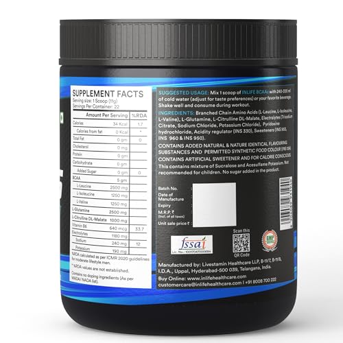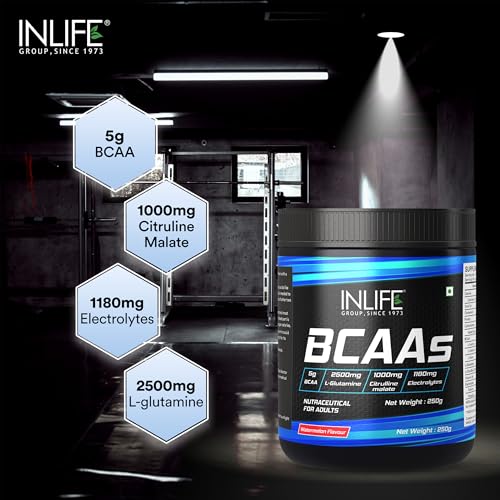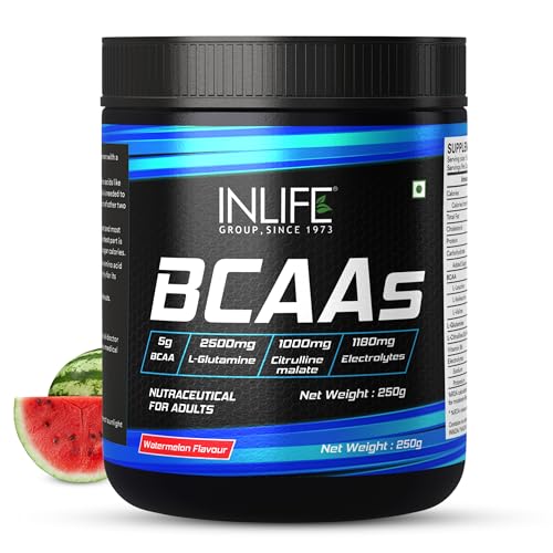 7 GRAMS Branched Chain Amino Acid (BCAA) Formula: Engineered with the optimal 2:1:1 ratio of L-Leucine L-Isoleucine and L-Valine this potent branched chain formula helps to rebuild lean muscle and reduce soreness after a workout. This formula also contains added L-Glutamine L-Citrulline Malate Vitamin B6 with Electrolytes and will deliver noticeable results in your bodybuilding crossfit or powerlifting training. MUSCLE BUILDING AND STRENGTH: Boost muscle growth and metabolism with this instantized BCAA branched chain amino acids that boosts muscle strength fast. This 100% pure pre / post workout BCAA powder promotes protein synthesis boosts lean muscle growth and minimizes tissue damage that normally occurs after intense strength training so you can make the most out of your workouts. MUSCLE REPAIR AND RECOVERY: The essential amino acids leucine isoleucine and valine acts as transport vehicles for faster absorption which translates to faster post-workout recovery and better performance results. Electrolytes for hydration to recover from a strenuous workout and help fight muscle breakdown during recovery. SUGGESTED USAGE: Mix 1 scoop of INLIFE BCAA Branched Chain Amino Acid with 240-300 ml of cold water (adjust to taste preferences) of your favourite beverage. Shake well and consume regularly. Drink plenty of water during workout. Our product contains the most effective formulation of trusted ingredients that are carefully processed and manufactured in a GMP certified manufacturing facility so you can be sure that you're safe. SHARE: Consider ordering one bottle for yourself and another for a friend or loved one. Keep each other motivated and reach your goals together and more quickly. INLIFE Healthcare stands by every quality product they make. We manufacture only premium and extra pure but high potency vitamins capsules tablets powders multivitamins herbal supplements and natural herbal skin & personal care products for men women and children.