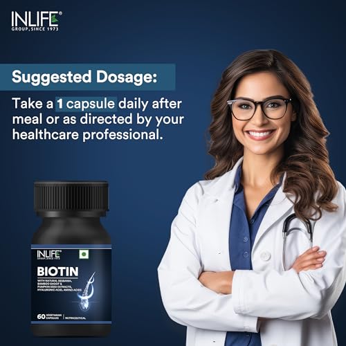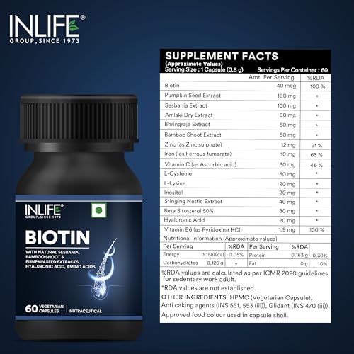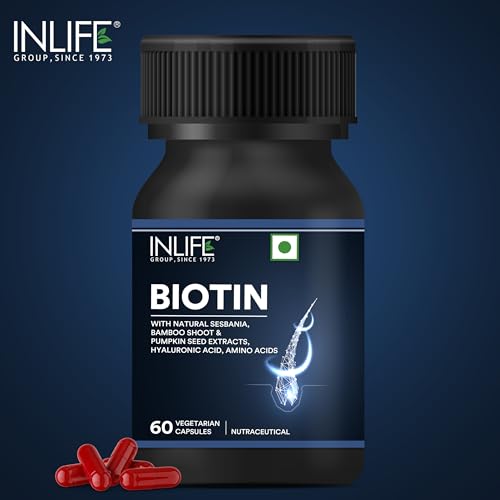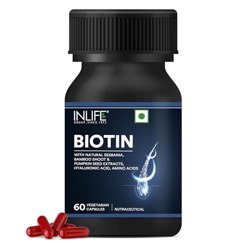 Support Healthy Hair & Nails with Biotin: Biotin is a vital B-vitamin that helps to support healthy hair and nail maintenance. Immerse yourself in the natural goodness of Pumpkin Seed Sesbania Amlaki Dry Bhringraj Bamboo Shoot and Stinging Nettle. These botanicals may support overall well-being of your hair and nails. It contains an array of essential nutrients including Zinc Iron Vitamin C L-Cysteine L-Lysine Inositol and Vitamin B6. These components combine to support balanced nourishment for your hair and nails. Hyaluronic acid may support skin hydration contributing to the well-being of your hair and nails. Vegetarian Capsules: Each bottle contains 60 vegetarian capsules ensuring compatibility with various dietary preferences. Experience the wholesome benefits of INLIFE Biotin Supplement with Natural Herbs. Elevate your daily routine by incorporating this supplement and give your hair and nails the attention they deserve. Unlock the potential of natural ingredients and make INLIFE Biotin Supplement a part of your self-care regimen today!