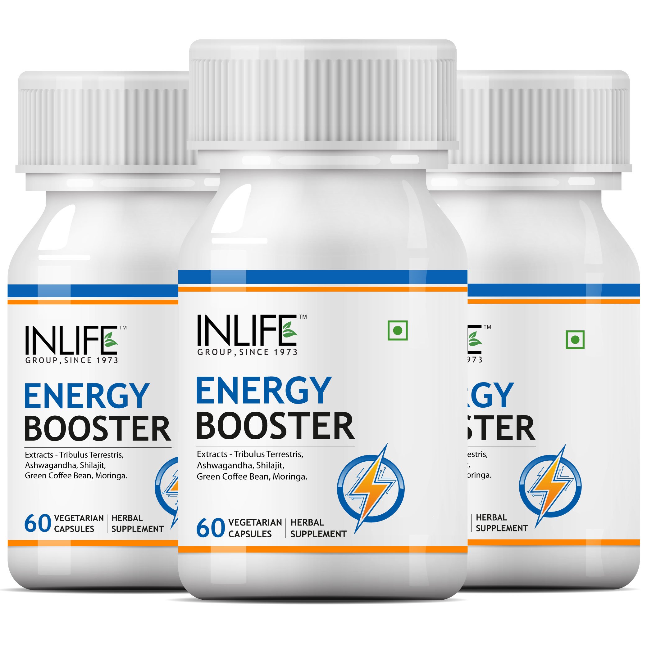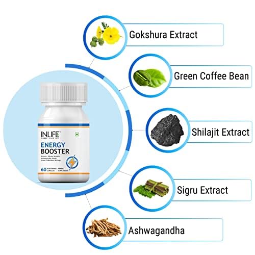 INLIFE ENERGY BOOSTER CAPSULES: It contain energy supportive herbs such as Green Coffee Bean Gokshura (Tribulus Terrestris) Moringa Shilajit and Ashwaghandha which help provide you with extreme focus energy and alertness without tingling or restlessness feeling.GREEN COFFEE BEAN and other herbs provide you natural caffeine for focus attention energy and alertness that allows you to be your most productive self. HERBAL SUPPLEMENT: This fast-acting booster formula was carefully formulated to provide the perfect blend of herbs to promote healthy performance positive mood natural energy and help reach your mind's full potential. LEVEL UP - Pump up your workouts and energy levels with an increase in endurance while promoting lean muscle mass with this vegetarian supplement. You don't have to be a bodybuilder to see benefits INLIFE Energy Booster Capsules promotes a faster recovery time between workouts and enhances your body's natural ability to reduce body fat while promoting muscle growth. BENEFITS: Stay alert and focused using safe and natural ingredients with INLIFE Energy booster capsules without caffeine jitters. It supports healthy activity combat stress enhance your mood & optimizes body functions at its best. SUGGESTED USAGE: Take 2 capsules daily each capsule before meal or as advised by your healthcare professional. Consider ordering one bottle for yourself and another for a friend or loved one. Keep each other motivated and reach your goals together and more quickly. INLIFE Healthcare stands by every quality product they make. We manufacture only premium and extra pure but high potency vitamins capsules pills tablets powders multivitamins supplements and natural herbal skin & personal care products for men women and children. Check INLIFE Healthcare out today!