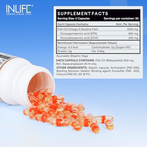 The ultimate natural source of Omega 3. Helps to maintain a healthy body for overall wellness. Mood brain power eye skin hair heart health and joint relief may be benefits of Quality Omega 3! This product can be combined with multivitamins vitamin d3 coenzyme q10 zinc and vitamin e for extra health benefits! For optimal results take 2 capsules 3 times a day after meal or as directed by a healthcare professional. Purity through molecular distillation. Our fish oil is purified with molecular distillation - one of the few current methods that can purify from heavy metals PCB's and other toxins to below detectable limits for human consumption. All supplements are made in GMP certified facilities. 1000mg Fish Oil per serving with 300mg Omega-3 (180 mg EPA 120 mg DHA). Fish oil must have an adequate amount of EPA and DHA to have positive effect on your health. Our fish oil is encapsulated in liquid filled hard shell capsules that are having many advantages over soft gels. It contains 4-5 times less gelatine requires no other additives consists of water and gelatine only are stable in hot climates thereby do not stick together and become gluey like soft gelatine capsules will disintegrate faster due to the capsule wall being 5 times thinner than the walls of soft gelatine capsules less product migration into the shell less diffusion of odours. Consider ordering one bottle for yourself and another for a friend or loved one. Keep each other motivated and reach your goals together and more quickly. INLIFE Healthcare stands by every quality product they make. We manufacture only premium and extra pure but high potency vitamins capsules tablets powders multivitamins herbal supplements and natural herbal skin & personal care products for men women and children. Check INLIFE Healthcare out today!