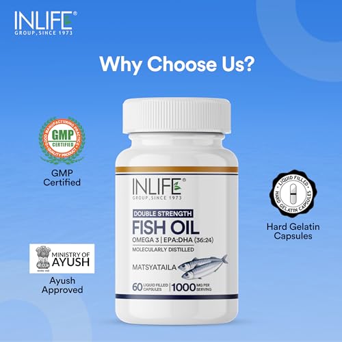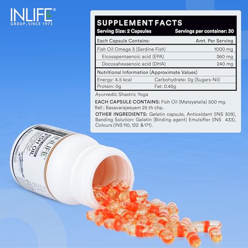 The ultimate natural source of Omega 3. Helps to maintain a healthy body for overall wellness. Mood brain power eye skin hair heart health and joint relief may be benefits of Quality Omega 3! This product can be combined with multivitamins vitamin d3 coenzyme q10 zinc and vitamin e for extra health benefits! For optimal results take 2 capsules 3 times a day after meal or as directed by a healthcare professional. Purity through molecular distillation. Our fish oil is purified with molecular distillation - one of the few current methods that can purify from heavy metals PCB's and other toxins to below detectable limits for human consumption. All supplements are made in GMP certified facilities. 1000mg Fish Oil per serving with 300mg Omega-3 (180 mg EPA 120 mg DHA). Fish oil must have an adequate amount of EPA and DHA to have positive effect on your health. Our fish oil is encapsulated in liquid filled hard shell capsules that are having many advantages over soft gels. It contains 4-5 times less gelatine requires no other additives consists of water and gelatine only are stable in hot climates thereby do not stick together and become gluey like soft gelatine capsules will disintegrate faster due to the capsule wall being 5 times thinner than the walls of soft gelatine capsules less product migration into the shell less diffusion of odours. Consider ordering one bottle for yourself and another for a friend or loved one. Keep each other motivated and reach your goals together and more quickly. INLIFE Healthcare stands by every quality product they make. We manufacture only premium and extra pure but high potency vitamins capsules tablets powders multivitamins herbal supplements and natural herbal skin & personal care products for men women and children. Check INLIFE Healthcare out today!