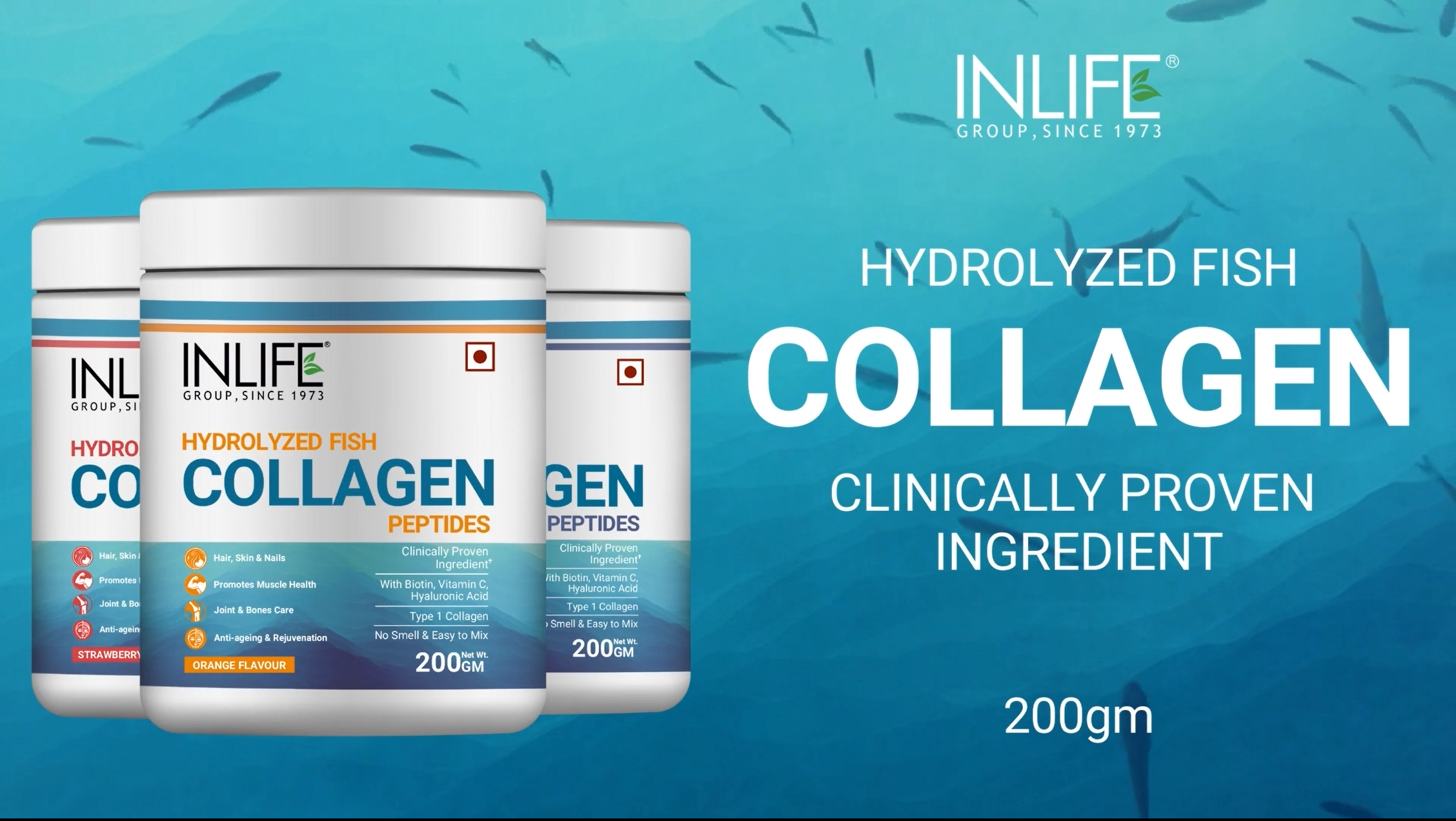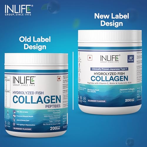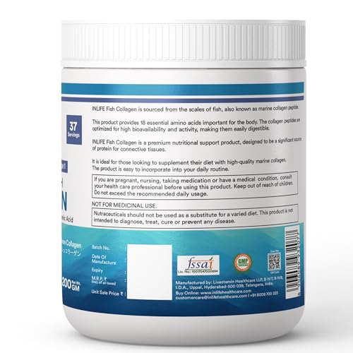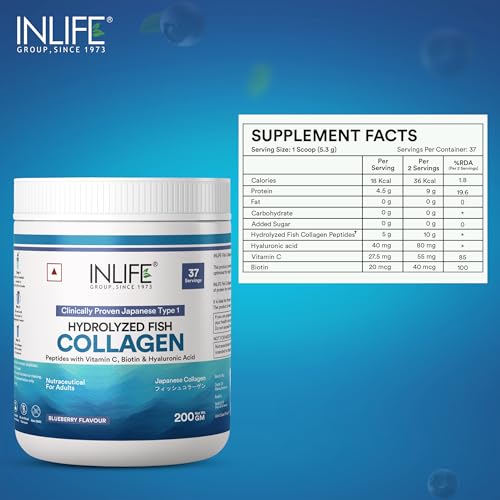 Clinically Proven Ingredient: INLIFE Hydrolyzed Fish Collagen is manufactured using Clinically Proven Type 1 Fish Collagen Ingredient. It is also known as marine collagen powder that provides 18 essential amino acid crucial for human body and health. Hydrolyzed Form: Fish Collagen Peptides are manufactured from the scales of the fish. The collagen peptides are optimized for high bioavailability and the hydrolyzed form makes it easily digestible for humans. Benefits: INLIFE Fish Collagen Powder is fortified with Hyaluronic Acid Biotin and Vitamin C thereby providing premium nutritional building blocks required to promote healthy hair skin and nails. It is major source of protein for connective tissues thereby it is useful in muscle building to promote joint & knee health and skin care. Suggested Usage: Add 1 to 2 levelled scoops of INLIFE Hydrolyzed Fish Collagen Peptides in 75ml to 150ml of water. Stir well until the powder is evenly dispersed in water & drink. Ingredients: Type 1 Hydrolyzed Fish Collagen Biotin Vitamin C & Hyaluronic Acid. Available in a bottle packing of 200 grams. Offered in three flavours: Orange Blueberry and Strawberry Lemon flavour. Store in a cool dry and dark place.