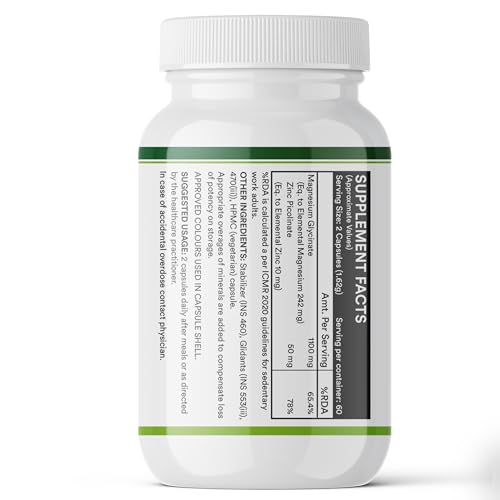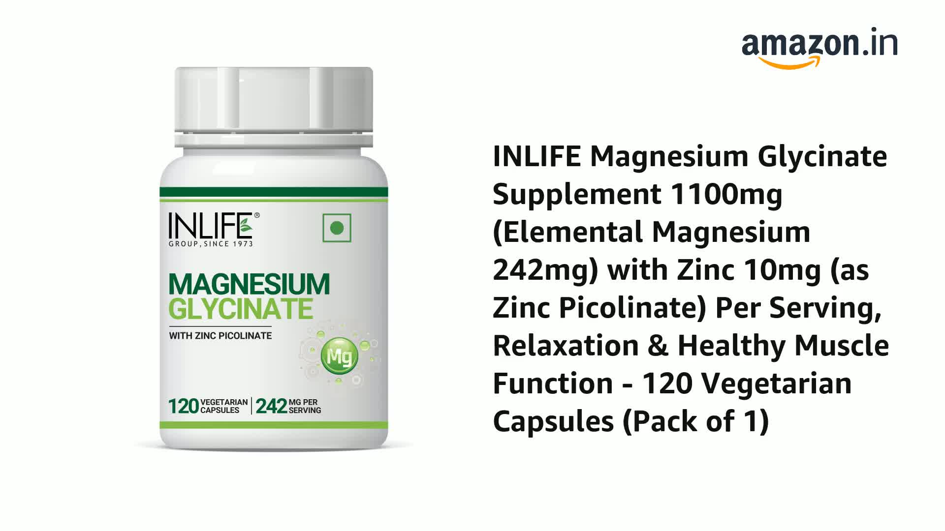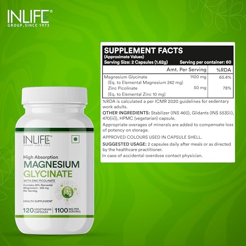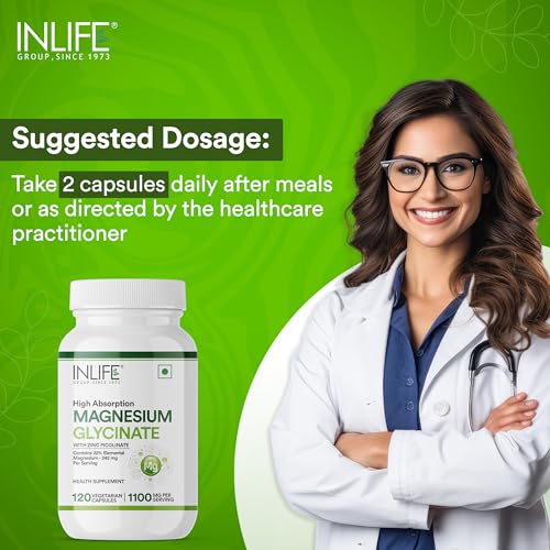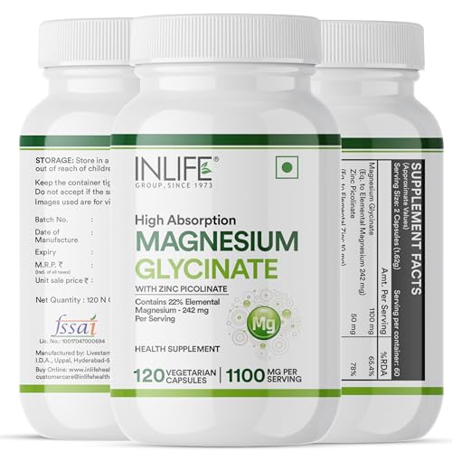 SUPERIOR ABSORPTION: INLIFE Magnesium Glycinate supplement contains High Absorption Magnesium that is offered in its chelated form of this mineral. It is more soluble than Magnesium Oxide. BENEFITS: Magnesium bound with the amino acid glycine helps supports healthy relaxation and sleep. It provides nutritive support for natural calmness and healthy muscle function. IMPORTANCE: Magnesium is an essential mineral used by every organ in your body. It also plays a key role in regulating the bodyâs stress response system helps quite the nervous system helps promote relaxation helps to relieve muscle aches and muscle cramps promotes heart health. PREMIUM INGREDIENT: We use only a premium chelated Magnesium which is high absorption better tolerated and minimizes laxative effect. We only use the highest quality ingredients. PURITY: Our product contains the most natural and effective formulation of trusted ingredients that are carefully processed and manufactured in a GMP certified manufacturing facility so you can be sure that you are safe. Vegan and vegetarian friendly INLIFE Magnesium Glycinate Supplement Capsules is produced in gluten-free capsules.