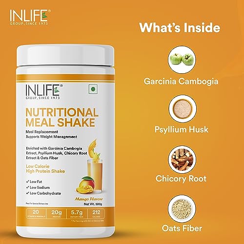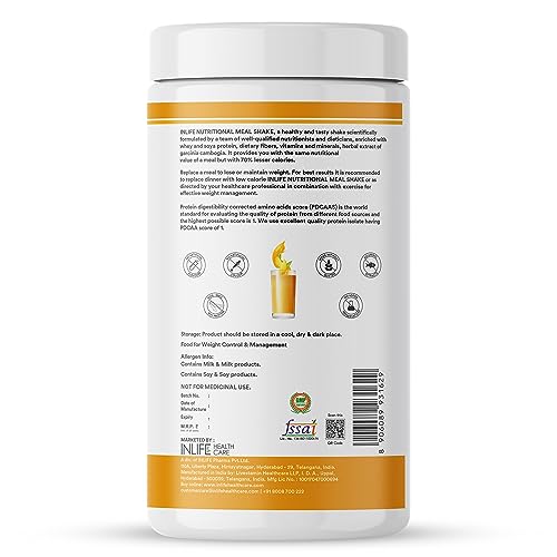 11 grams of clean protein with 27 essential vitamins and minerals and 3.09 grams of Dietary Fibre to keep you satisfied. Contains protein derived from Whey Protein Concentrate Soya Protein Isolate and Calcium Caseinate. It is enriched with Ayurvedic herbs like Garcinia Cambogia Green Tea Extract Green Coffee Bean extract that fights cravings and helps in weight management. Upto 70% lesser calories when compared to an average Indian meal. Contains NO ADDED SUGARS. Inlife Nutritional Meal Shake is manufactured in an ISO 22000 GMP certified manufacturing facility following WHO-GMP guidelines so you can be sure about the quality. No added preservatives no gluten no artificial flavours no animal extract.
