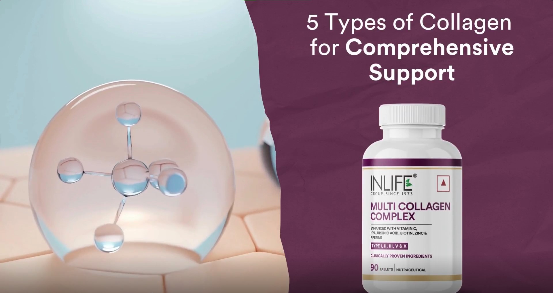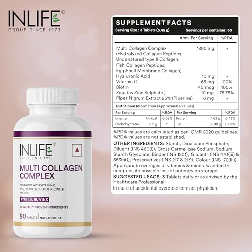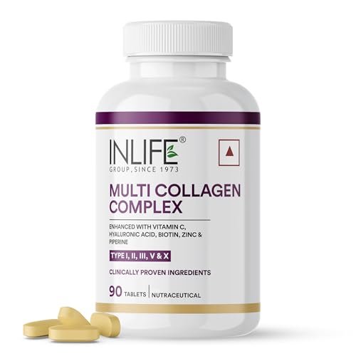INLIFE Multi Collagen Complex Tablets | 5 Types Peptides I, II, III, V & X with Biotin, Hyaluronic Acid | Collagen Powder Supplements for Women & Men - 90 Tablets (Pack of 2, 180)