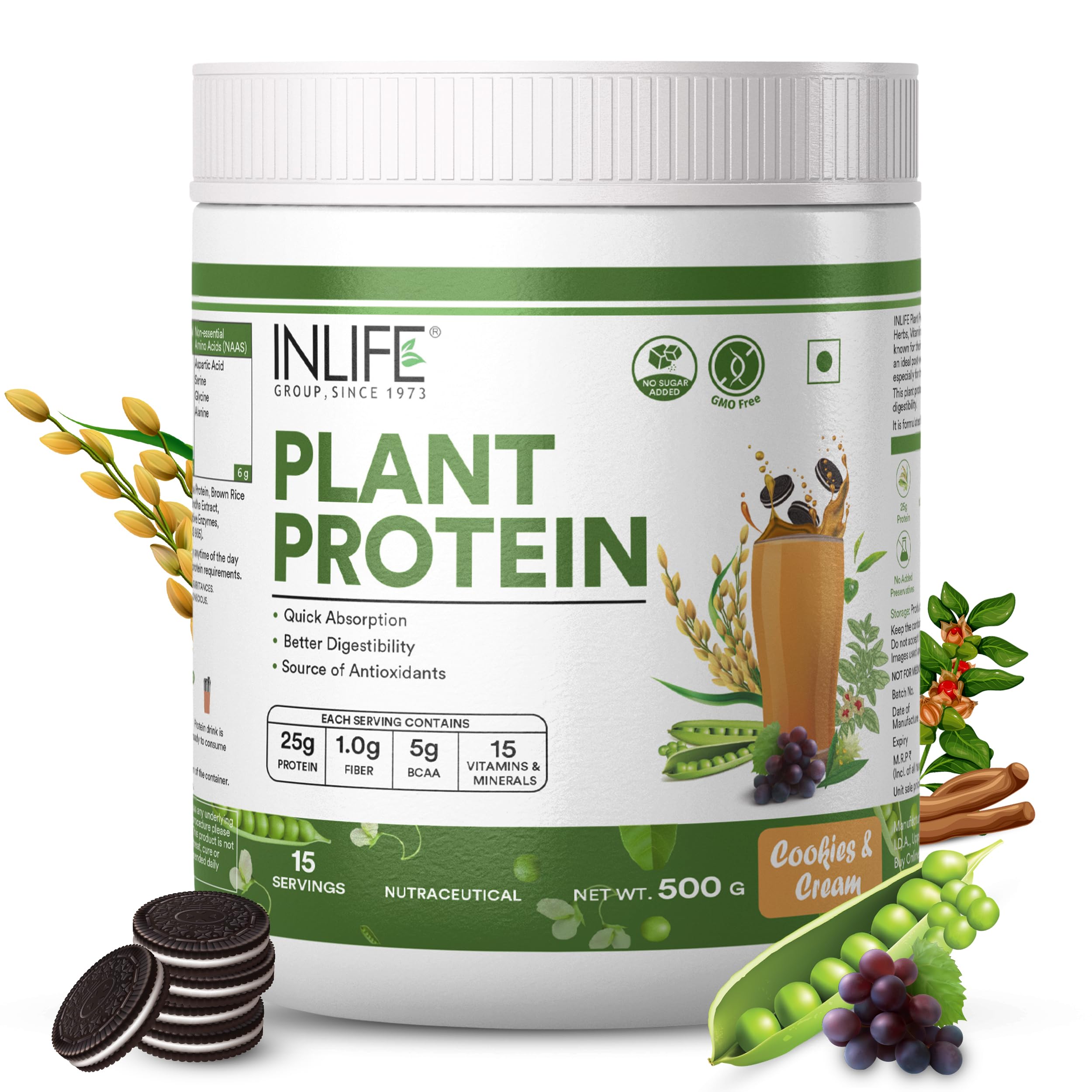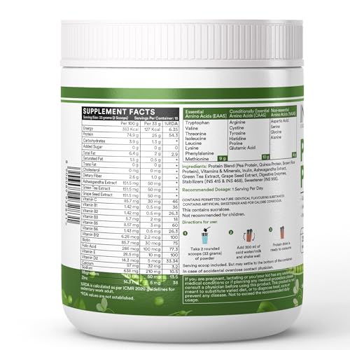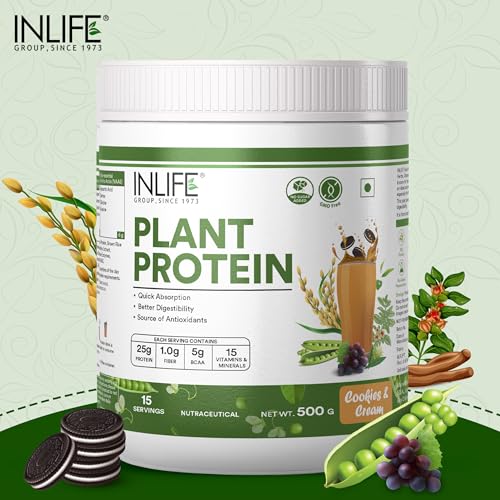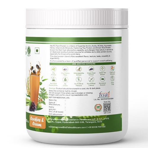 INLIFE Vegan Plant Based Protein Powder includes 24g of clean protein derived from Pea & Brown Rice Concentrate 1.8g of Dietary Fiber 5g of BCAAs. It is the best kind of protein powder if you want to improve your body composition. Not only is INLIFE Plant Protein full of high-quality protein but it also has the added benefit of digestive enzymes & dietary fiber to help you get the most out of each serving and puts the high-quality protein to work quickly and efficiently. INLIFE Plant Protein is formulated not only for an amazing taste but it also mixes easily and smoothly in your drink of choice. No chunks great flavour no stomach bloating. Nothing but high quality protein powder to fuel your muscles and a taste you will look forward to every time. Our product contains added Ayurvedic herbal extracts like Ashwagandha Green Tea & Grape seed along with the goodness of Turmeric. This supplement helps to keep your immune cells prime and ready for action supports normal immune function and improves your ability to cope with daily stress. Our Plant Protein has a clean profile to help you reach your nutrition and fitness goals in Vegan style. If you are planning to down calories or weight INLIFE plant based protein powder is the right choice that can get you there.