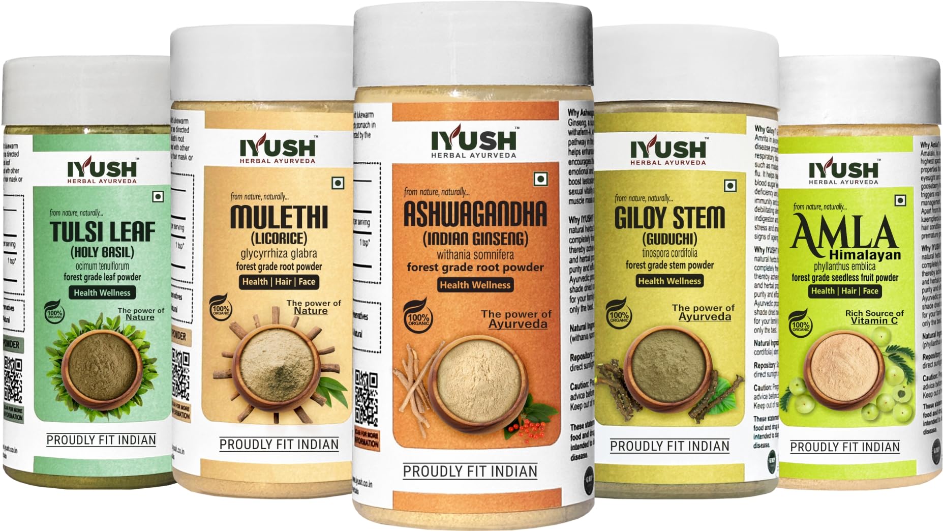 IYUSH Herbal Ayurveda Ashwagandha Amla Giloy Mulethi Tulsi Powder (Immunity Booster Combo) - (Total 500gm)100gm each