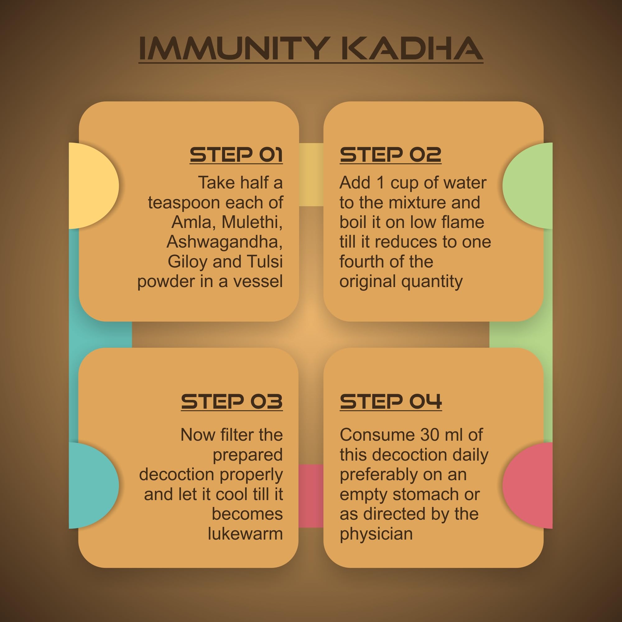 ANTI VIRAL DECOCTION : Add 1/4 tsp of each powder in a glass of water and boil it on low heat till it gets 1/4. Let it cool down and then sieve it well. Consume it preferably on an empty stomach in the morning and evening.