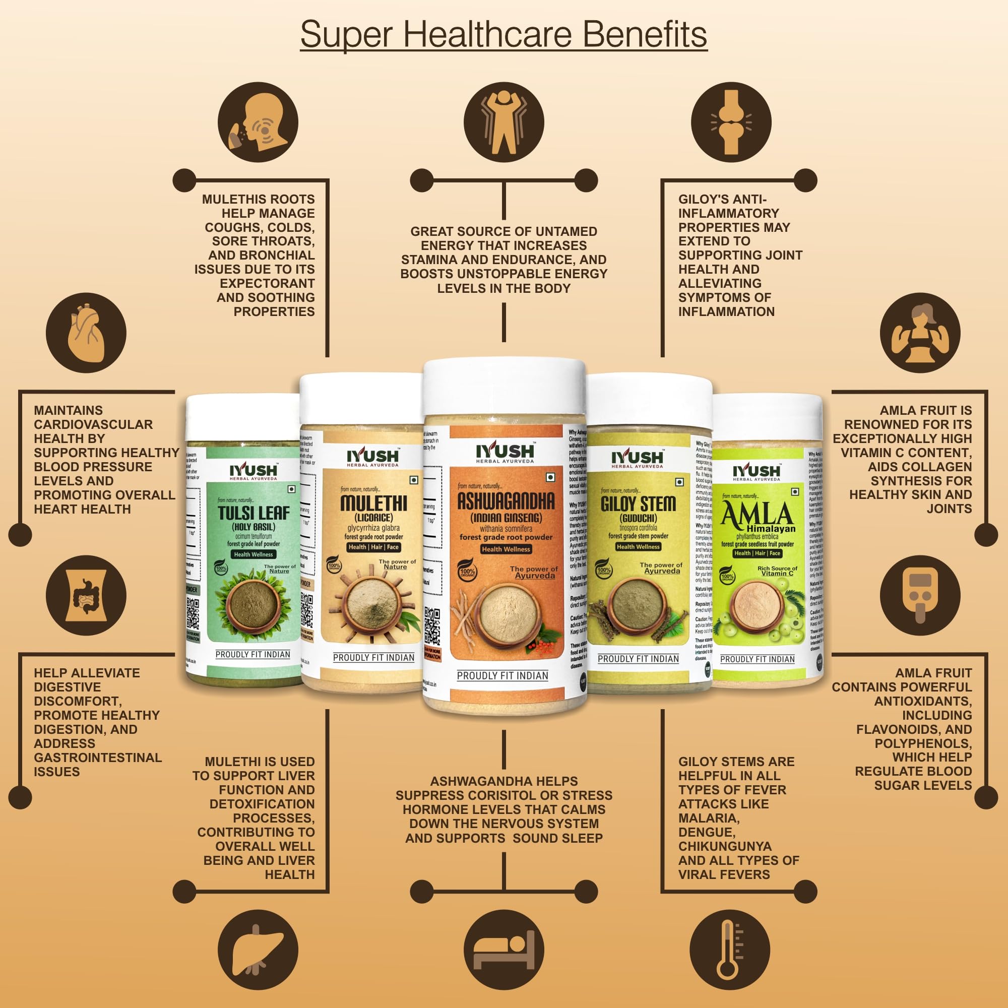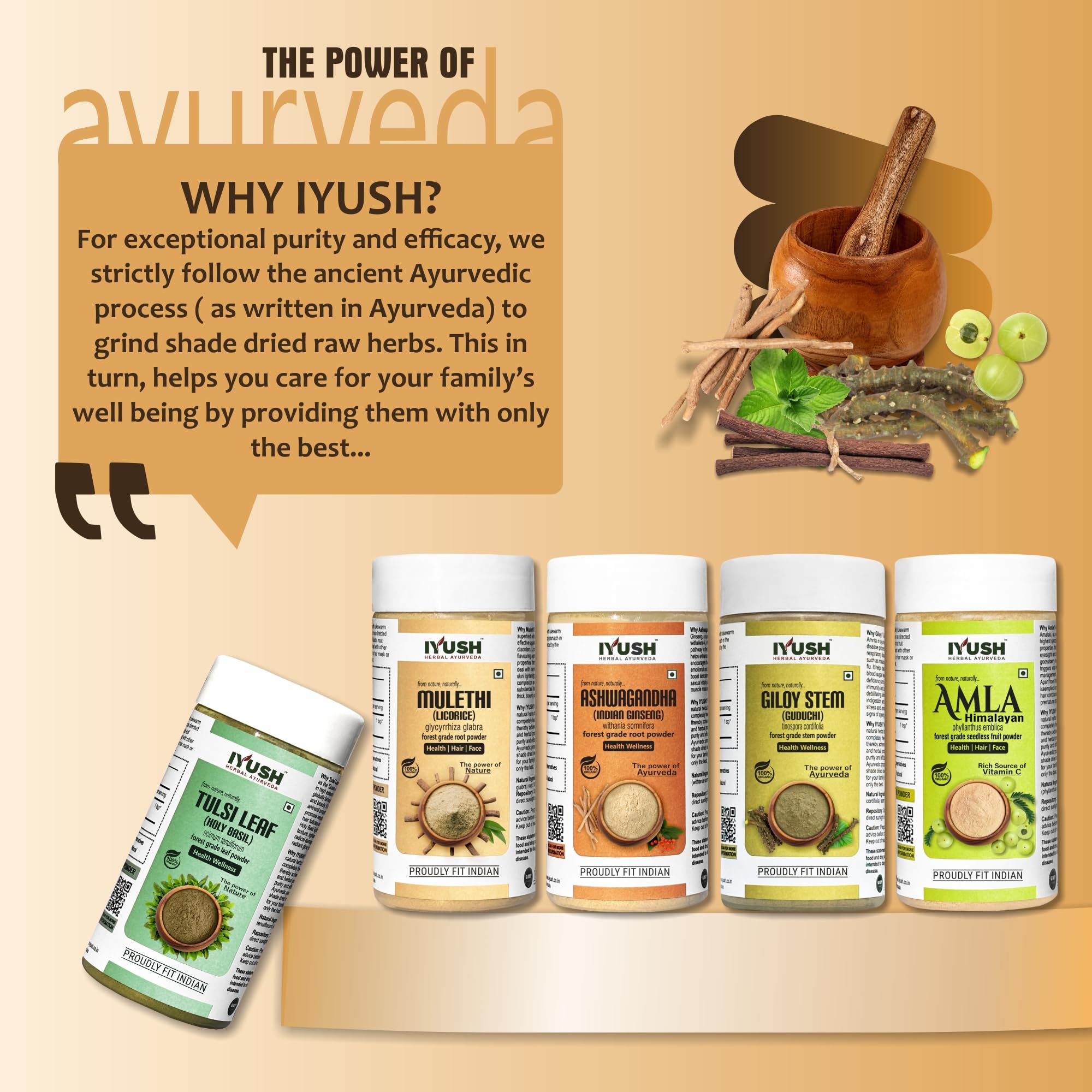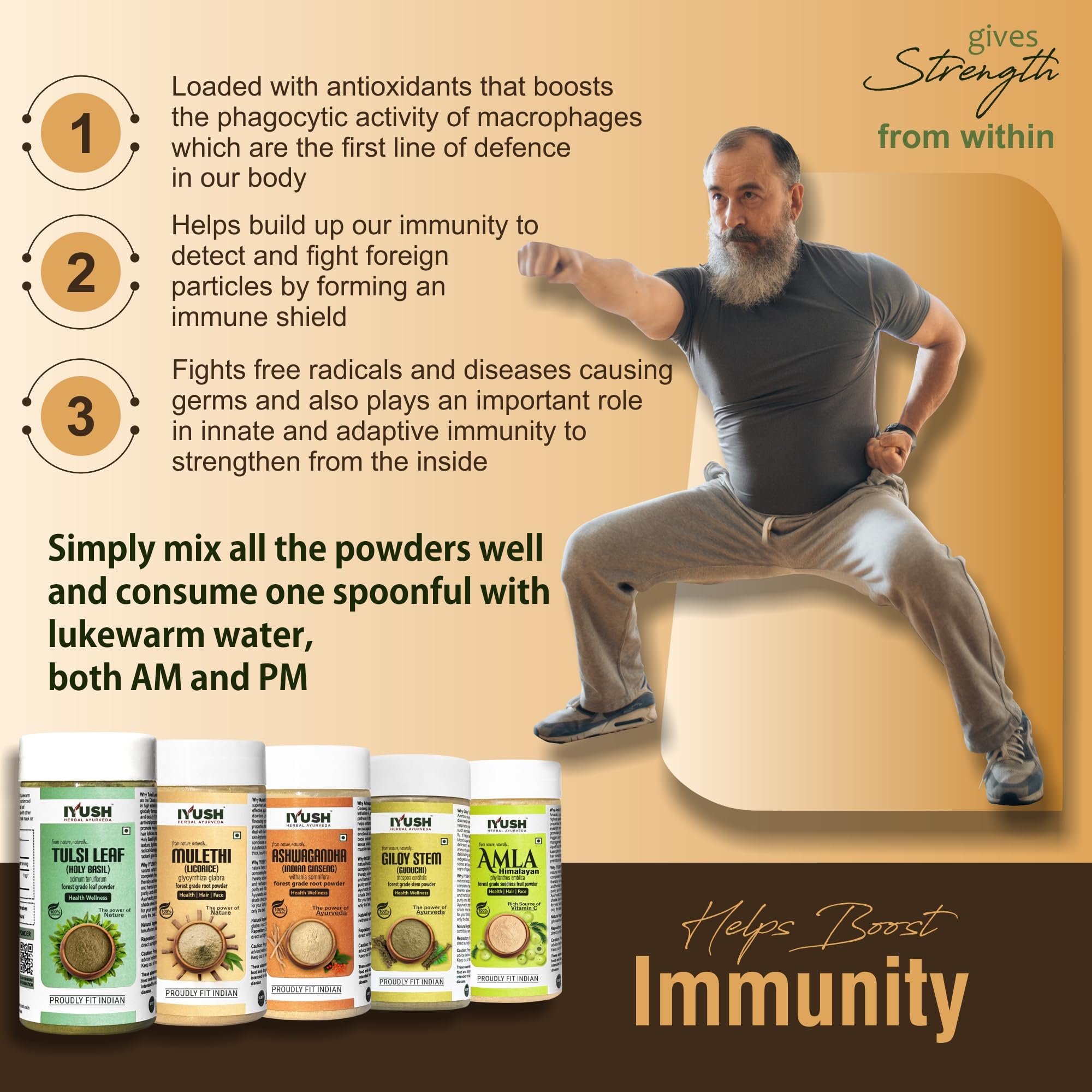 IYUSH Herbal Ayurveda's Immunity Booster combo includes wild forest grade Ashwagandha root Amla fruit Giloy stem Mulethi root and Tulsi leaf powder.It helps to boost our immune system and protect the body from virus attack