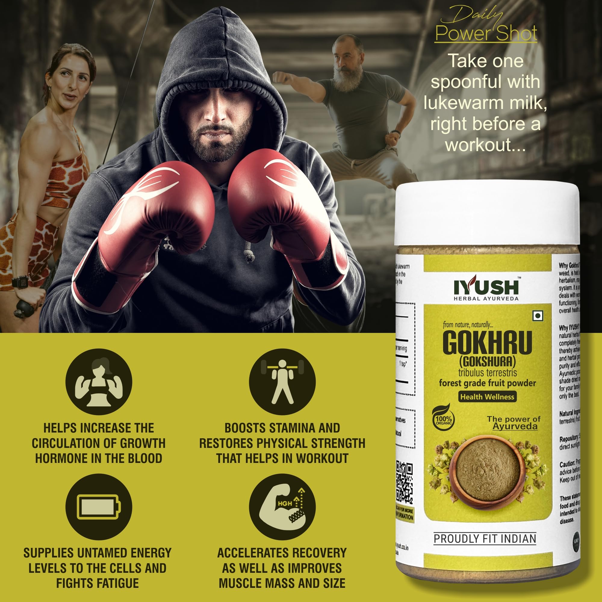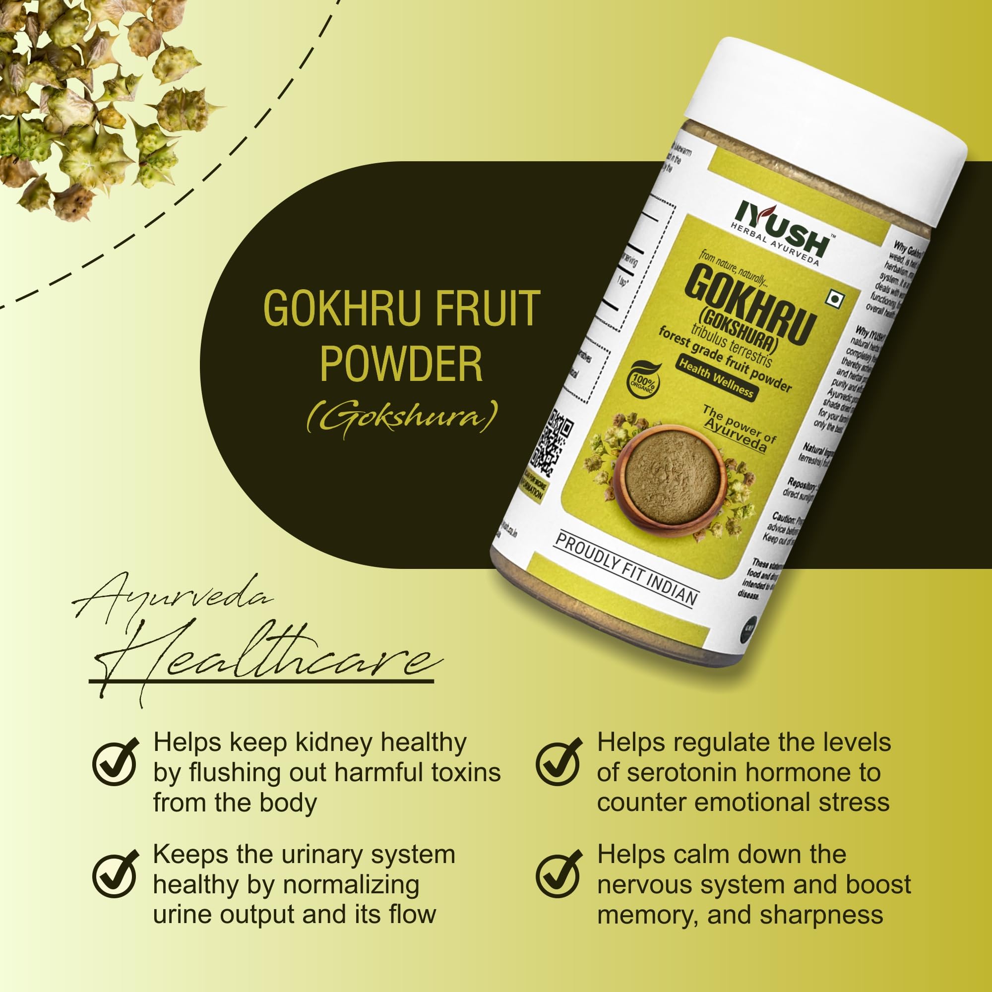 Gokhru or Gokshura also known as Tribulus terrestris is a natural herb that has been used in Ayurveda for centuries for numerous health benefits. It is an organic healthcare powder made from shade-dried wild forest grade Gokhru fruits that contain the highest active nutrients grown naturally without any harmful chemicals or pesticides or fertilizers.