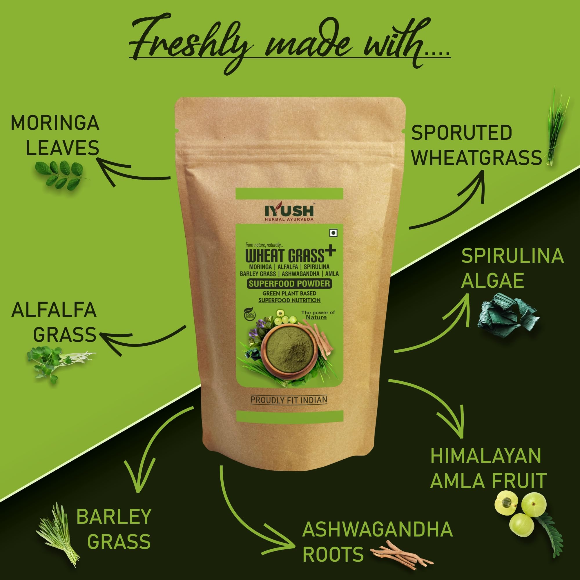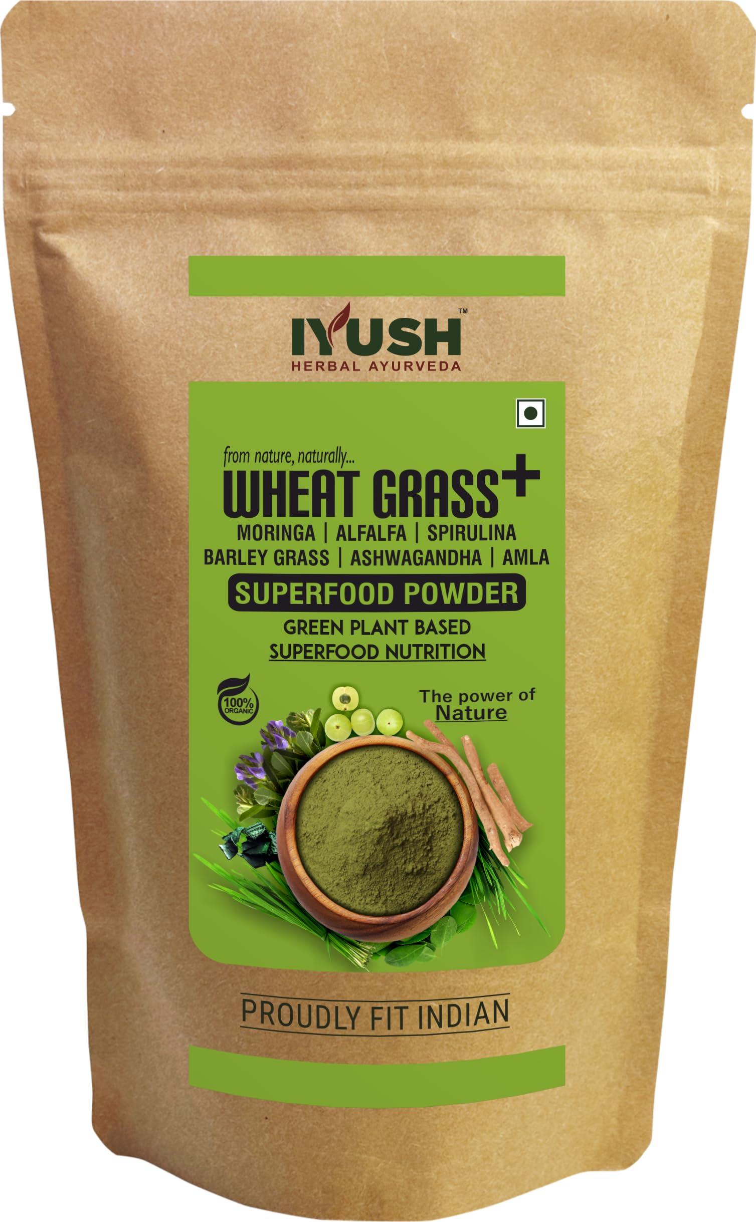 IYUSH Herbal Ayurveda Organic Wheat Grass Plus Moringa + Spirulina + Alfalfa + Barley Grass + Ashwagandha + Amla Multivitamin Superfood Powder - 900gm