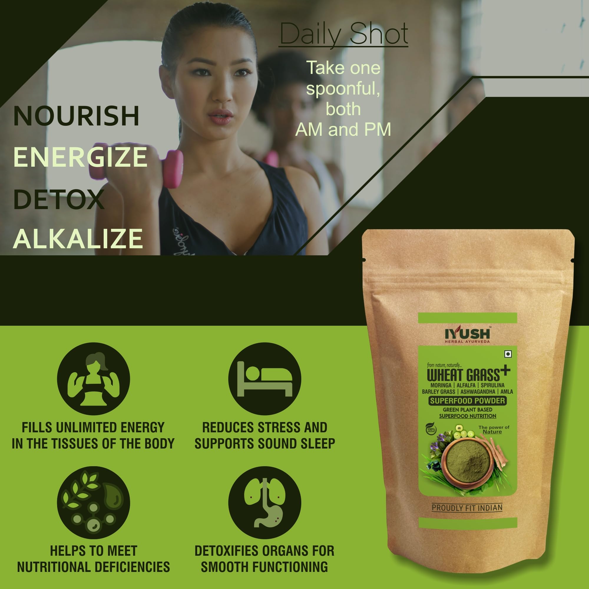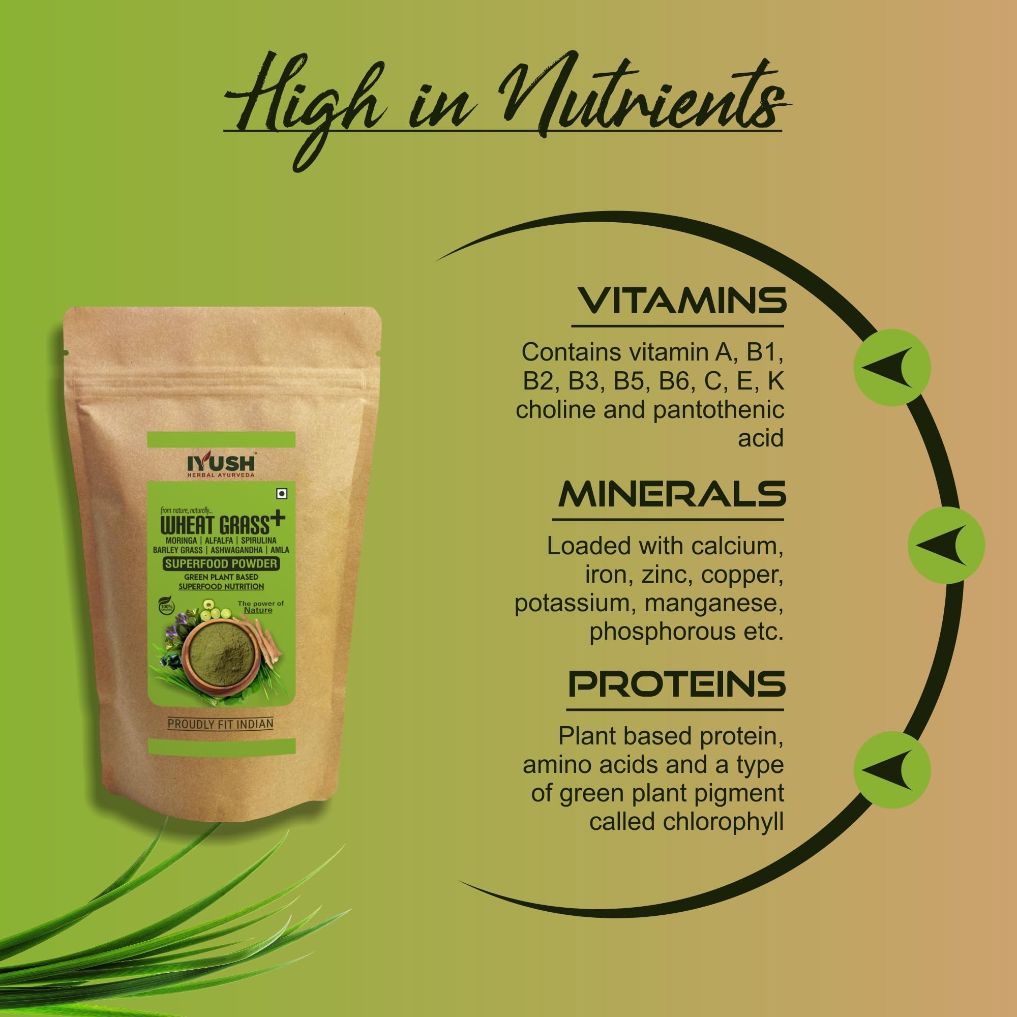 Wheat Grass Plus is a amazing combination of Wild Forest Grade Organic Moringa leaf Wheat Grass Spirulina Alfalfa grass Barley grass Ashwagandha root and Amla fruit. It is best solution for your daily nutrition needs which boosts immunity and overall energy level.
