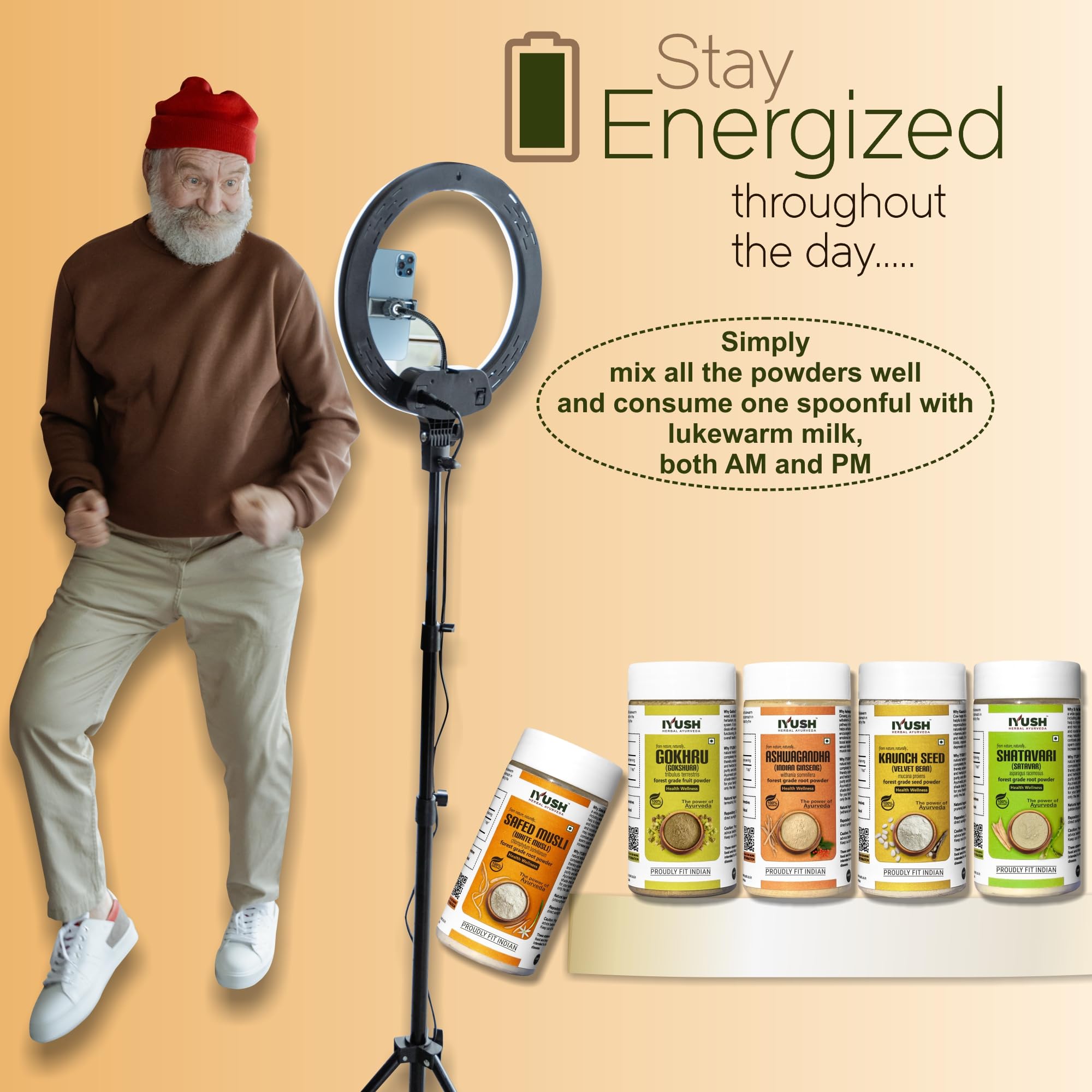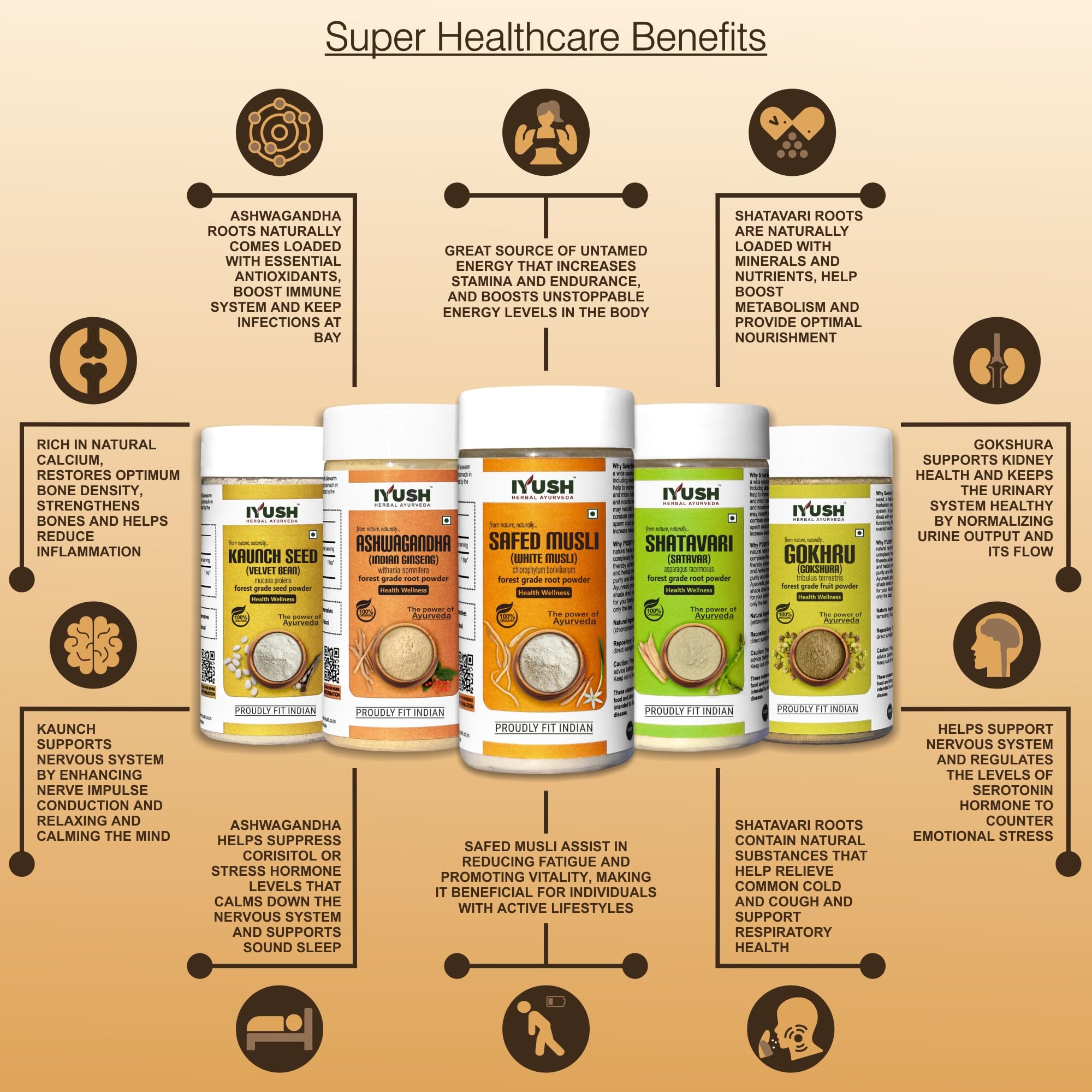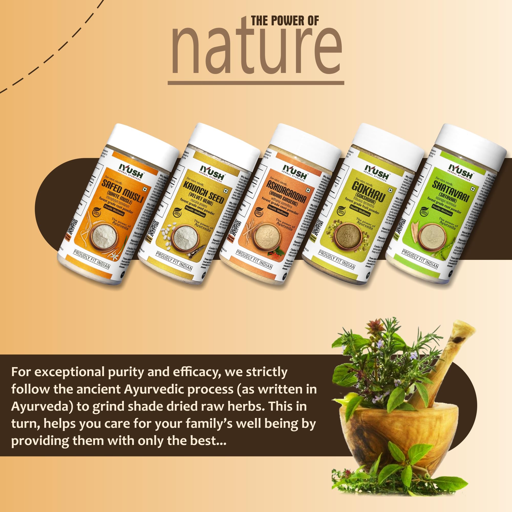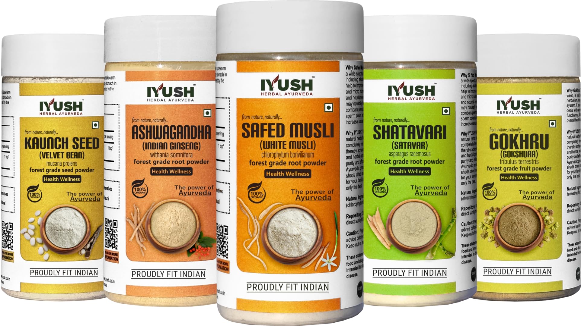 IYUSH Herbal Ayurveda Safed Musli Ashwagandha Kaunch Beej Shatavari Gokhru Powder - 100gm each