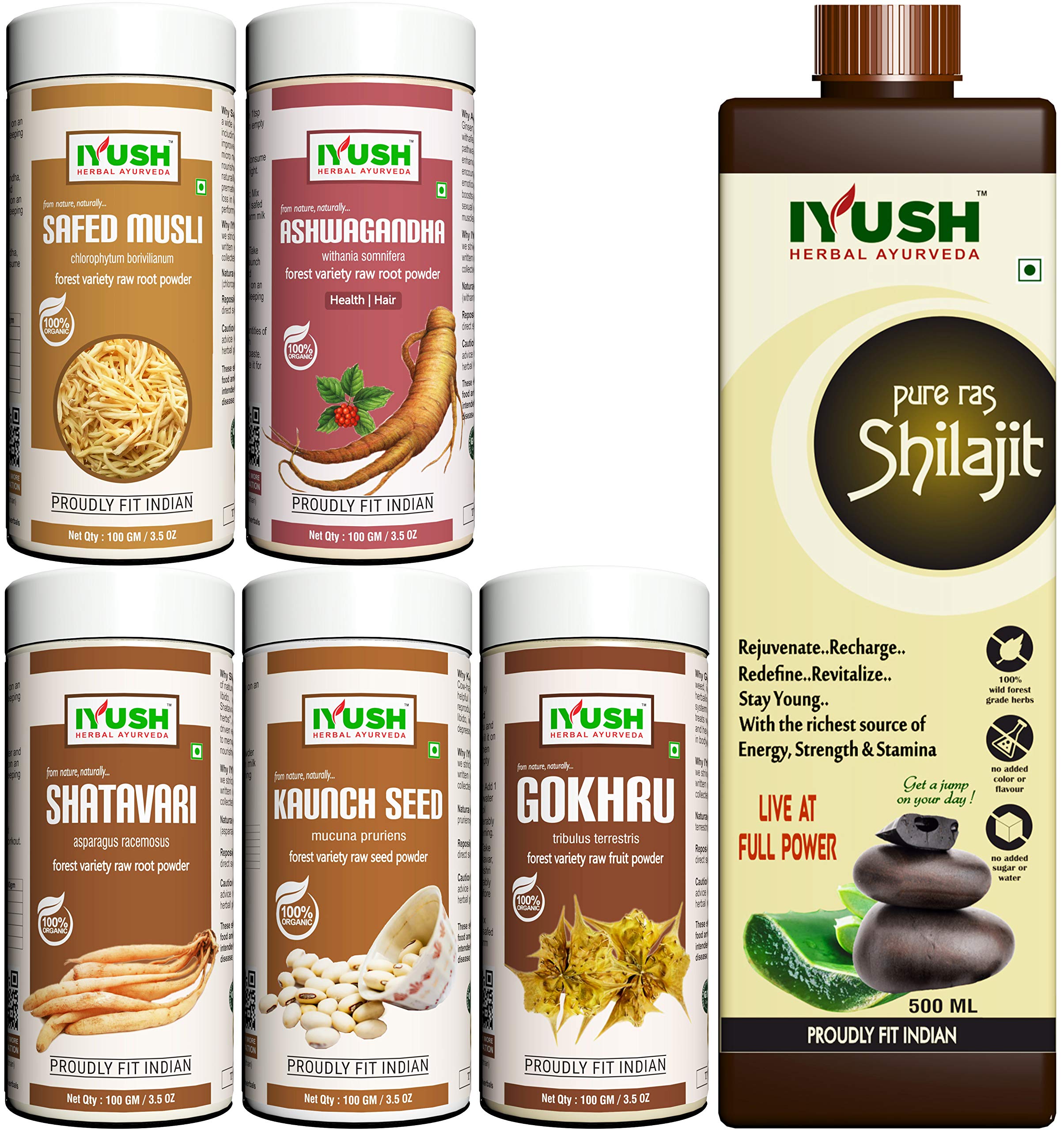 IYUSH Herbal Ayurveda Safed Musli Ashwagandha Kaunch Beej Shatavari Gokhru Powder Combo - Pack of 5 100gm each with Pure Shilajit Original Juice - 500 ml |