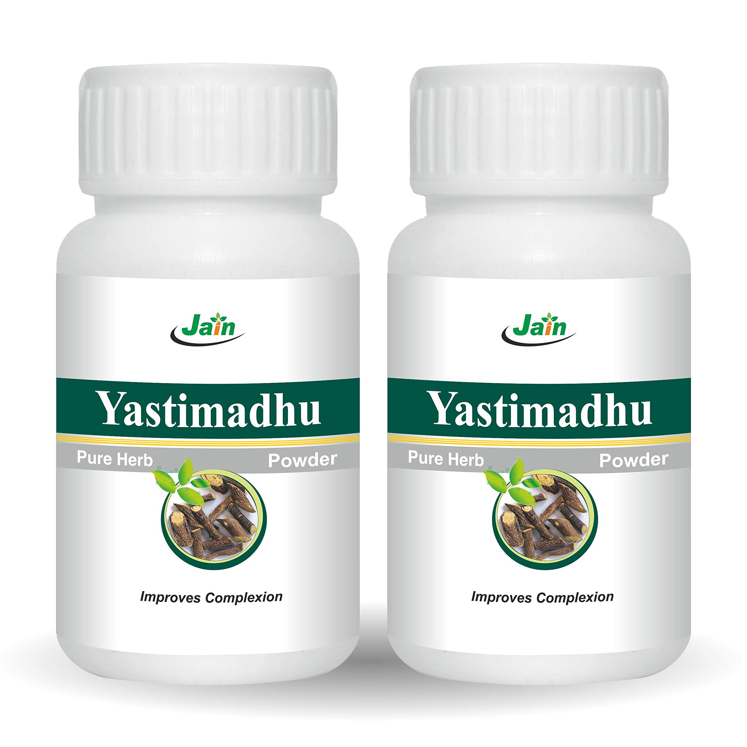 Jain Yastimadhu (Mulethi) Powder 100 g - 2 BottlesYastimadhu known as Mulethi / Licorice Powder is natural of the highest quality and comes with the purity guarantee from the brand. Dried and powdered in a hygiene facility this powder can be used widely in face masks to achieve beautiful radiant skin. The antibacterial and antioxidant properties in it helps to keep the skin free of scars and blemishes.Jain Ashwagandha Powder 100G (Pack Of 2)Ashwagandha (Withania somnifera) is one of the most highly regarded and commonly used adaptogens in the Ayurvedic pharmacopoeia. Maximizing the body's ability to resist stress it enables the body to reserve and sustain vital energy throughout the day while promoting sound restful sleep at night.*This potent herb is used to promote muscle strength and to support comfortable joint movement. It is also used to maintain potency and a healthy libido for it is said to bestow upon its user the vitality and strength of a horse. As a rejuvenative Ashwagandha is particularly useful to seniors and for anyone that would benefit from a nourishing natural source of energy.