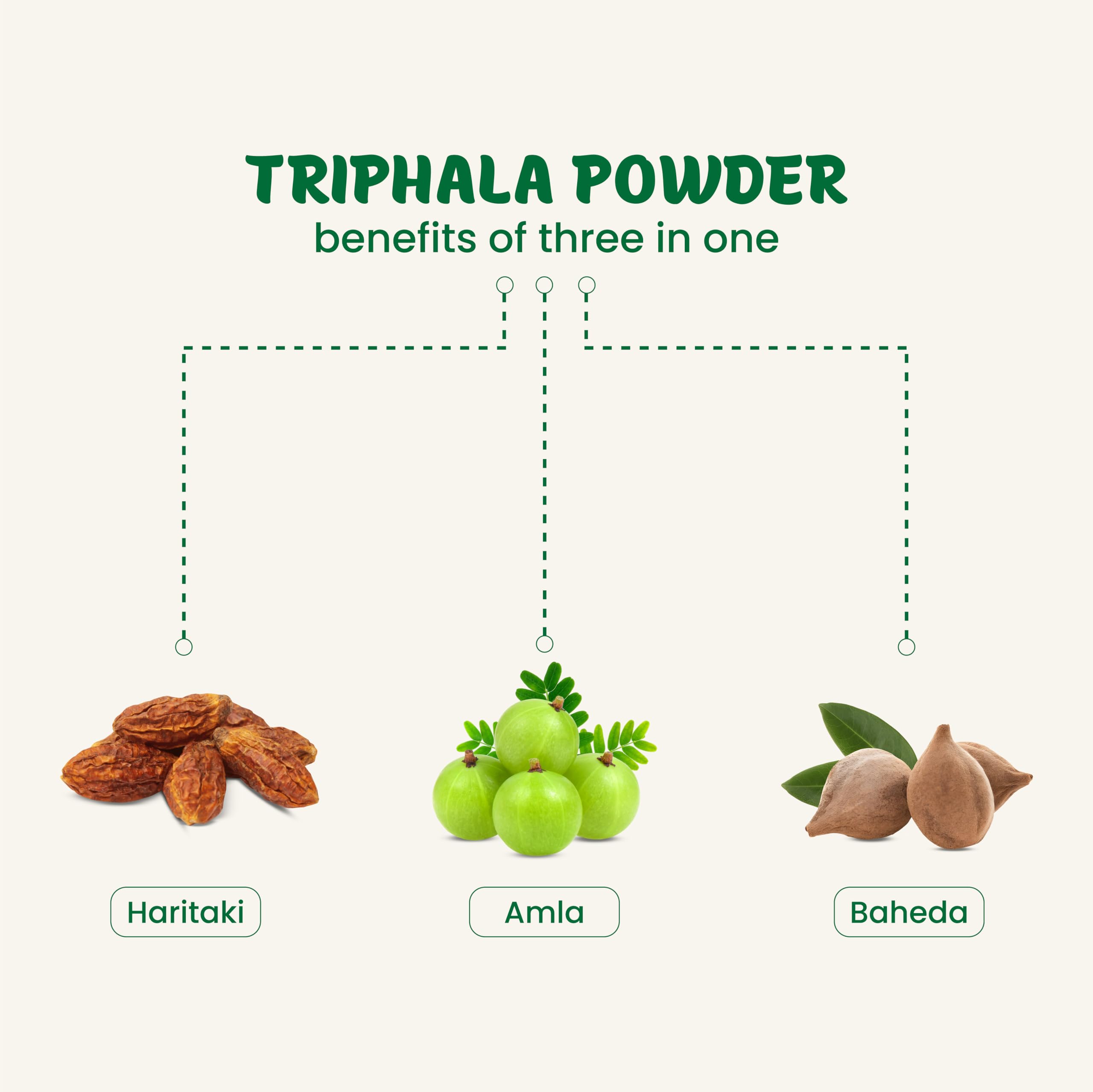 SUPPORTS OVER ALL HEALTH : Triphala powder a blend of three fruits: haritaki amalaki (or amla) and bibhitaki is a nutritional powerhouse providing essential vitamins and minerals that support overall health. Not only that it's also a contains powerful ant