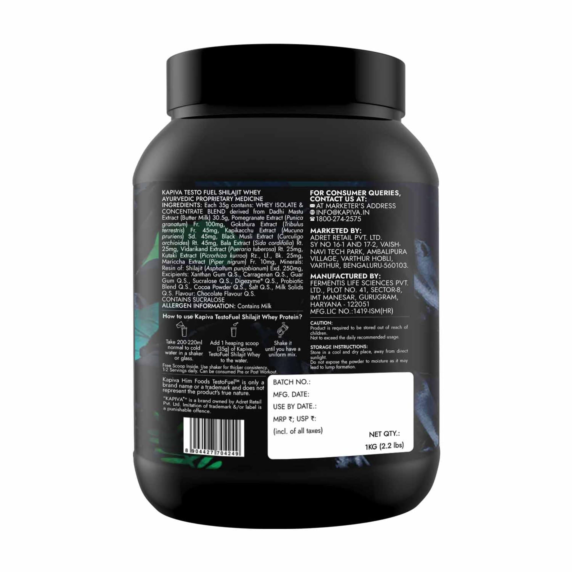 How to use - 1.Take 200-220ml normal to cold water in a shaker or glass.2.Add 1 heaping scoop (35g) of Kapiva TestoFuel Shilajit Whey to the water. 3.Shake it until you have a uniform mix. Free Scoop Inside. Use shaker for thicker consistency. 1-2 Serving