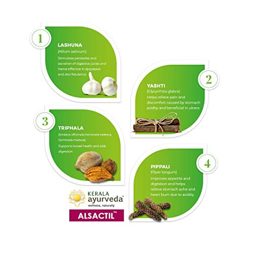 Ingredients: Each alsactil tablet contains: extracts of â lashuna (allium sativum) 27. 2 Mg yashti (glycyrrhiza glabra) 27. 2 Mg triphala (emblica officinalis terminalia belerica terminalia chebula) 10 mg powders of âtriphala (emblica officinalis terminalia belerica terminalia chebula. ) 30 Mg musta (cyperus rotundus) 26 mg durva (cynodon dactylon). 26 Mg kapardica 15 mg saindava lavana 9 mg maricha (piper nigrum) 6. 5 Mg pippali (piper longum). 6. 5 Mg.