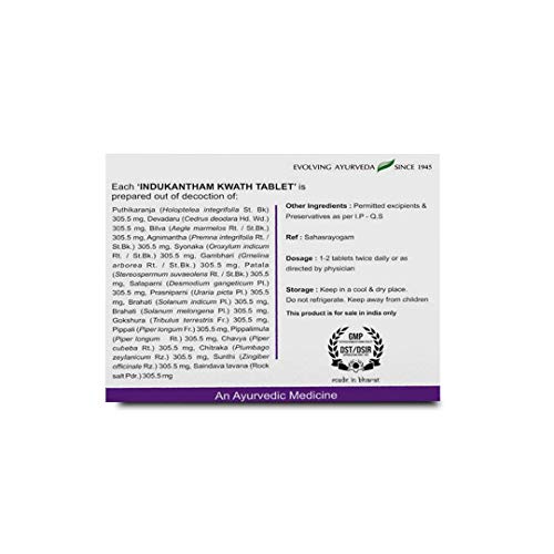 • Quantity: 100 Pcs; Indukantham Kwath Tablet is a polyherbal medicated preparation in a modified kashayam form. It contains an ideal combination of herbs which helps nourish the mucosa of GIT and provides immunity strength and resistance to the body.