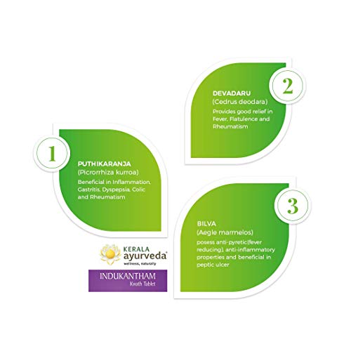 • Indukantham Kwath Tablet helps pacify chronic and intermittent fever due to its antipyretic property. It also helps in relieving gaseous distension colic bloating flatulence etc.