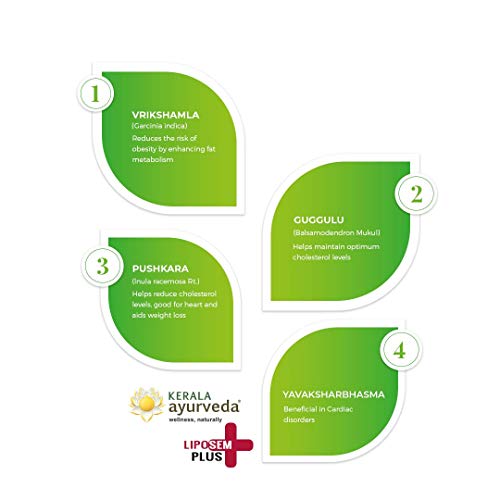 Ingredients: Liposem plus tablet each tablet is prepared out of extracts of: vrikshamla (garcinia indica) - 200 mg guggulu (balsamodendron mukul) - 125 mg saptaranga (salacia chinensis) - 100 mg arjuna (terminalia arjuna) - 100 mg pushkara (inula racemosa) - 100 mg salmali (bombax malabaricum) - 60 mg madhuka (madhuca indica) - 50 mg sahachara (barleria prionitis) - 50 mg ketaki (pandanus tectorius) - 50 mg gokshura (tribulus terrestris) - 50 mg kadali (musa paradisiaca) - 50 mg rakta citraka (plumbago indica) - 10 mg jyotishmati (celastrus paniculata) - 16 mg takkola (ilicium verum) - 14 mg saurabhanimba (murraya koennigii) - 2 mg nimba (azadirachta indica) - 2 mg powder of (yavakshar bhasmam) - 10 mg.