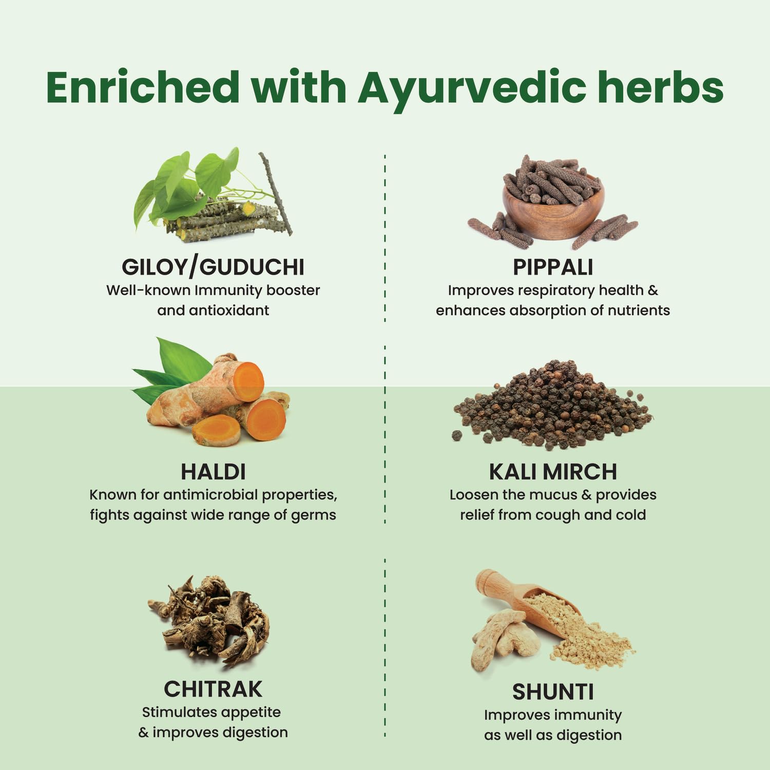 With the highest concentration of Giloy One of the main ingredients well known as an immunity booster. It helps to build immunity reduces stress controls blood sugar levels and also helps in digestion.