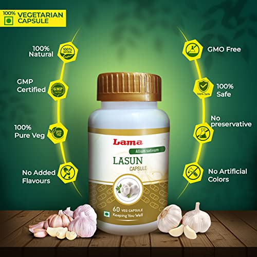 Lama Lasun veg Capsule helps prevent atherosclerosis. It strengthens immune system and helps maintain proper cholesterol level. It helps normalize high blood pressure and reduce cough & cold. It contains no preservatives no added flavour no artificial colour and is GMO free.