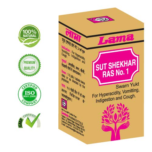 Lama Sutsekhar Ras with Gold helps reduces Pitta dosha and helps reduce symptoms like heartburn nausea vomiting abdominal pain hiccup fever breathing troubles and headache.