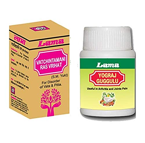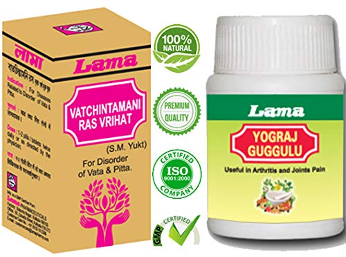 Lama Vatchintamani Ras 25 Tablets with Gold and Pearl AND Lama Yograj Guggulu 80 Tablets (Combo Pack) a classical Ayurvedic combo product from Lama Pharmaceuticals a trusted name in Ayurveda since 1982.