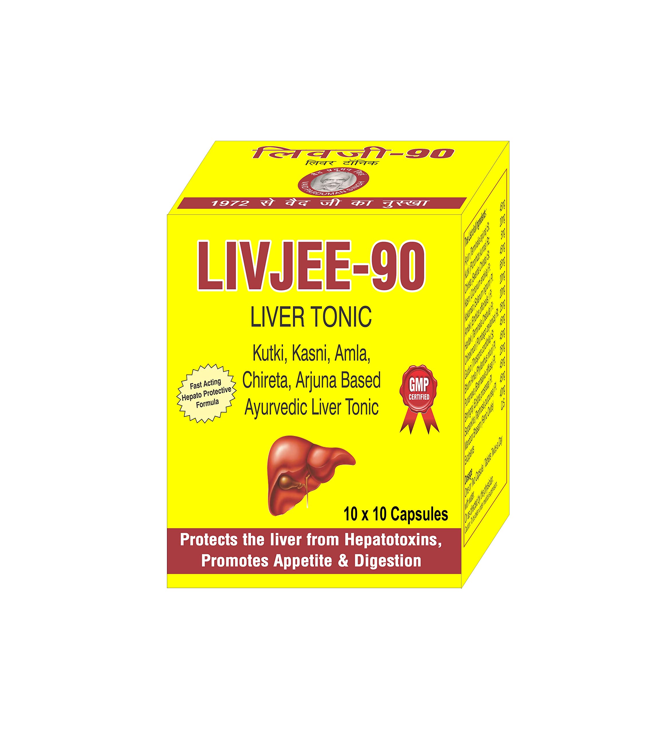 Livjee 90 Liver care Capsules is a ayurvedic medicine. Which is formulated by Dr. Asma Herbals Amritsar. Which is research and formulation of C P Singh Chawla {Ayurved Expert B.Sc. (Medical) & D Pharma (Ayurvedic)}. Firstly it is used to defend the liver from diseases. Secondly as our liver is one of the largest and most vital organ. Thirdly liver acts as body’s natural filter. In fact our liver filters the toxins and chemicals in our blood removes wastes from our body. In conclusion It helps to undo the damaging effects of alcohol fat sugar and each one the selection toxins your liver’s been forced to technique over the years — or once a weekend binge. True List of all Ingredients: Herbs used in the formulationQuantity Arjun (Terminalia arjuna) St.45mg Kutki (Picrorhiza kurroa) Rz.20mg Chireta (Swertia chirata) St.5mg Kasni (Cichorium endivia) Fr.45mg Kakamaci (Solanum nigrum) Pl.65mg Amlaki (Emblica officinalis) Fr.20mg Haritaki (Terminalia chebula) Fr.20mg Chitrakmool (Plumbago zeylanica) Rt.25mg Guduci (Tinospora cordifolia) St.45mg Bhumi Amla (Phyllanthus niruri) Pl.45mg Punarnava (Boerhaavia diffusa) Pl.25mg Bhringraj (Eclipta prostrata) Pl.45mg Sarpankha (Tephrosia purpurea) Pl.45mg Mandoor Bhasam (Ferric Oxide)40mg ExcipientsQ.S. What are the benefits of Ayurvedic Livjee 90 Liver care Capsules? Firstly it promotes liver health. Secondly It defends liver cells from damage. Thirdly it stimulate the production of new liver cells. Moreover it detoxify the liver. Furthermore it improve blood circulation in the liver. Firstly our liver eventually processes everything we eat. Secondly once our abdomen and intestines finish digesting food it travels through our blood to our liver for filtering. Thirdly the liver breaks down fat to release energy. In fact it produces an enzyme as juice to help break down and absorb fat. In conclusion this organ also helps in sugar metabolism. What is the dosage of LivJee-90? 1-2 capsule twice