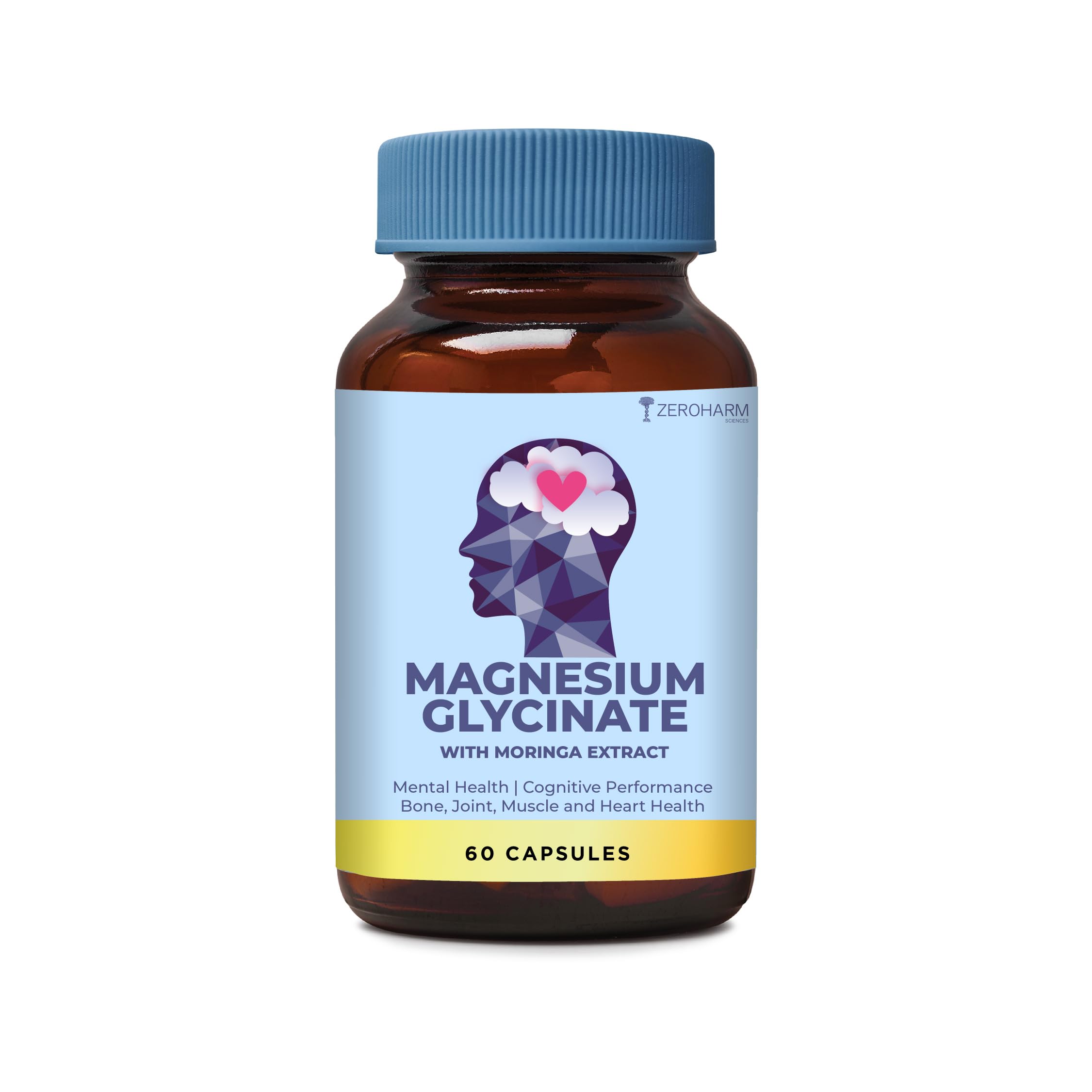 Magnesium Glycinate 1100mg with Moringa Extract - For Stress Sleep Muscle Relaxation Bone & Heart Health - High Absorption - Plant-Based Supplement for Men & Women - 60 Veg Capsules - By ZEROHARM