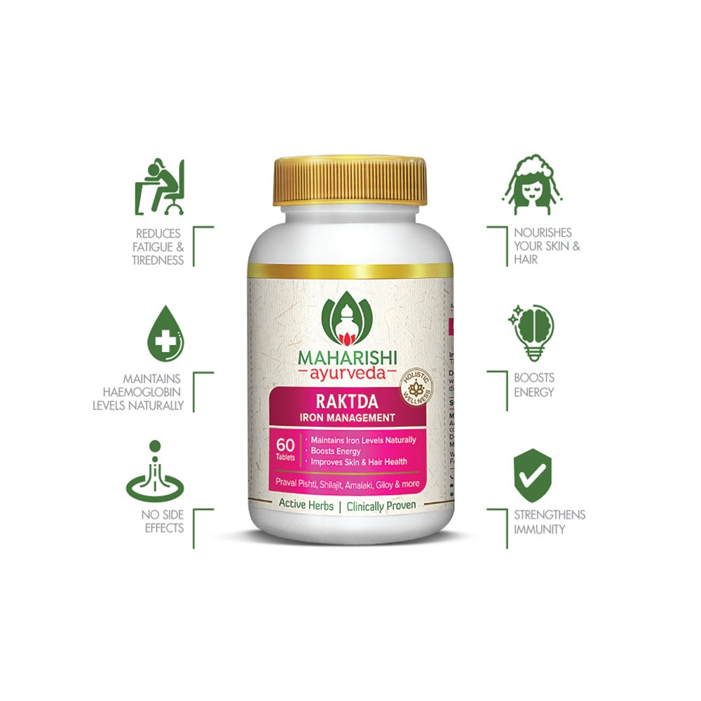 Maharishi Ayurveda Raktda Iron 60 TabletsErratic lifestyle, poor diet, tiredness, stress, workload, studies, family, these all are some common issues that often deprive todays women from maintaining a healthy life balance.We bring you Raktda, a solution that maintains hemoglobin levels naturally, boosts energy and restores skin & hair health.Note: The product is guaranteed to be 100% genuine. Product images are for illustrative purposes only. Images/packaging/ labels may vary from time to time due to changes made by the manufacturer's manufacturing batch and location. The product description is for information purposes only and may contain additional ingredients.Legal Disclaimer: Statements regarding dietary supplements hav