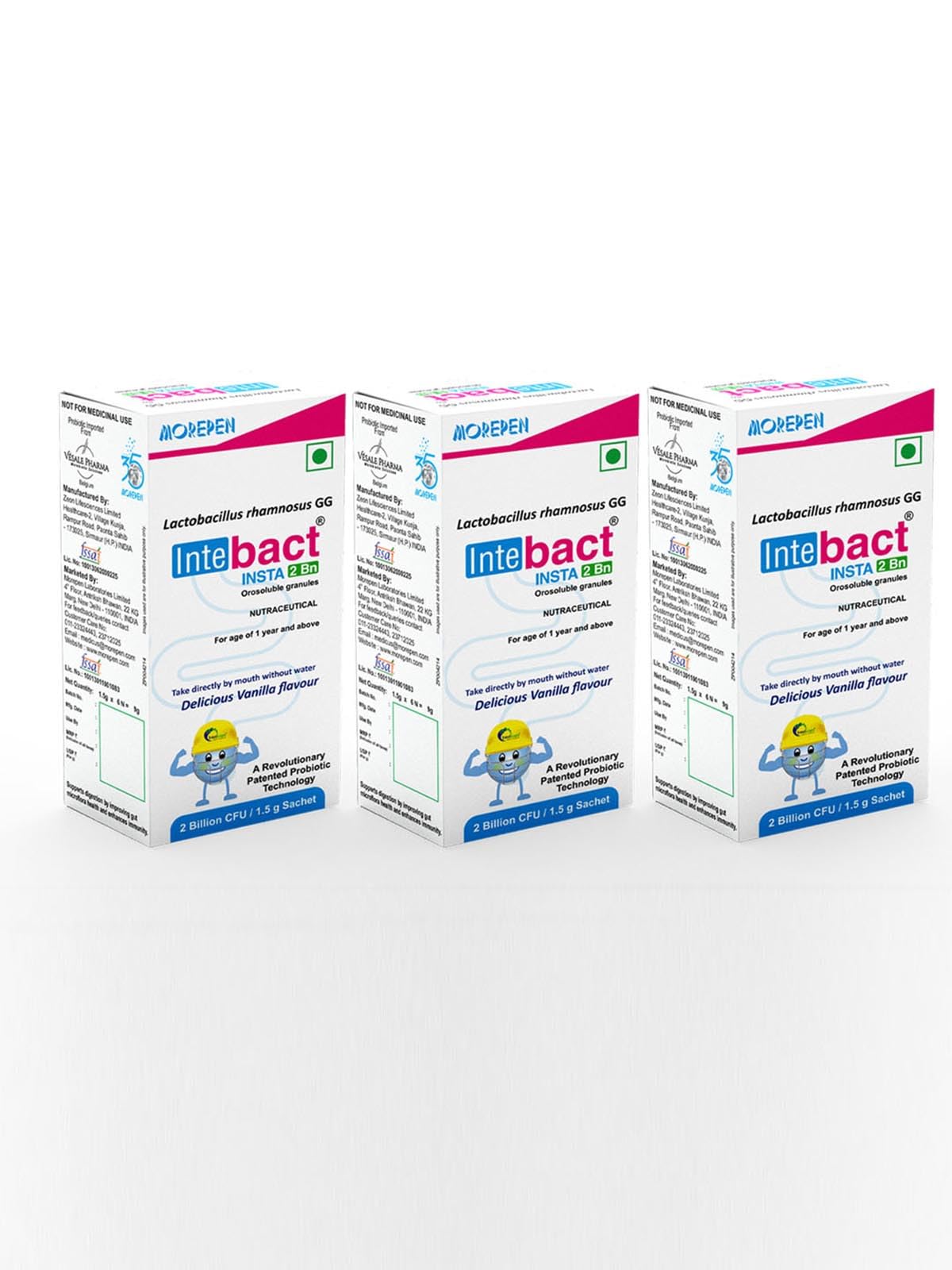 Morepen INTEBACT INSTA 2BN CFU|Probiotics Supplement for Gut Health, Vanilla flavour - 6 Sachets pack of 3