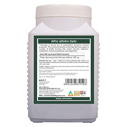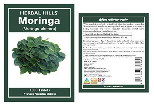 HERBAL HILLS Moringa Tablets Moringa leaf/Shugru/Drumstick leaf (Moringa Oleifera) 500 mg 1000 Tablets