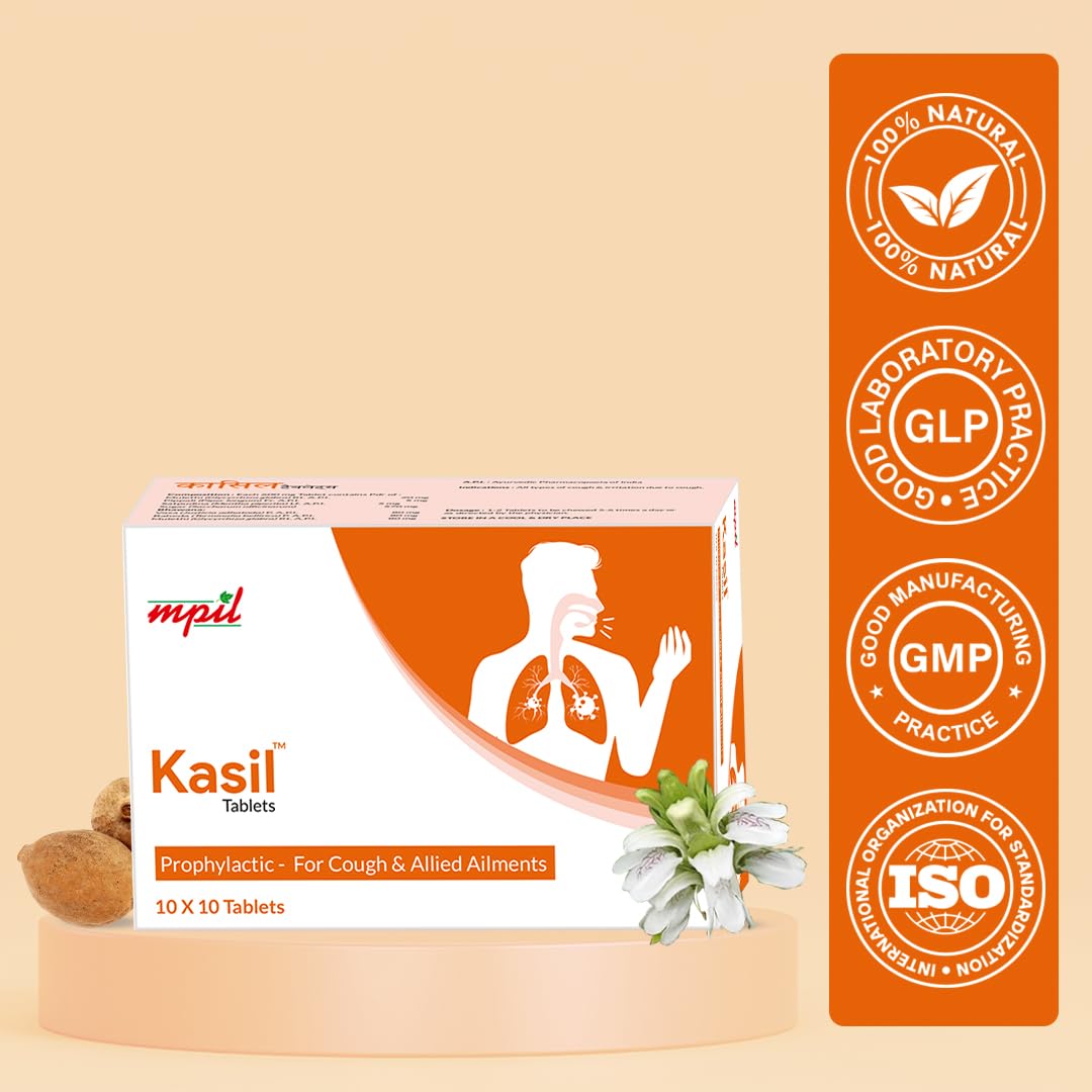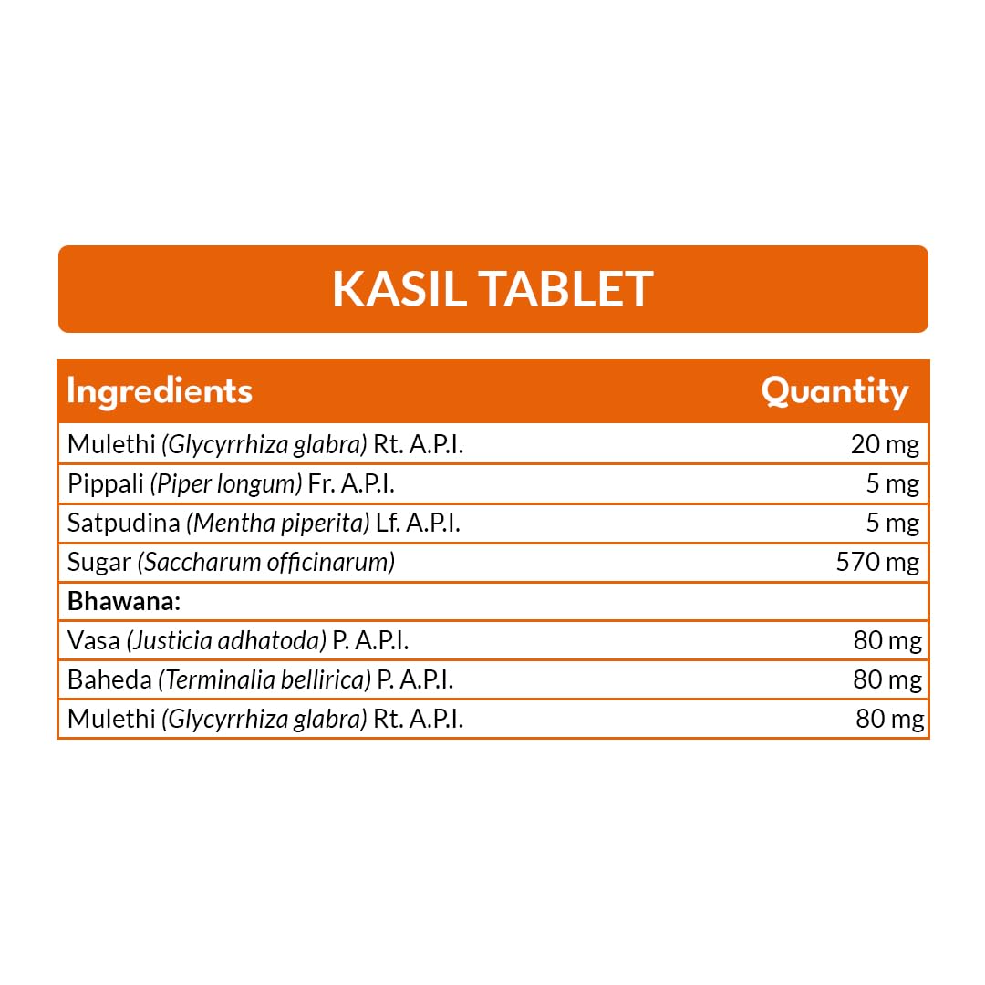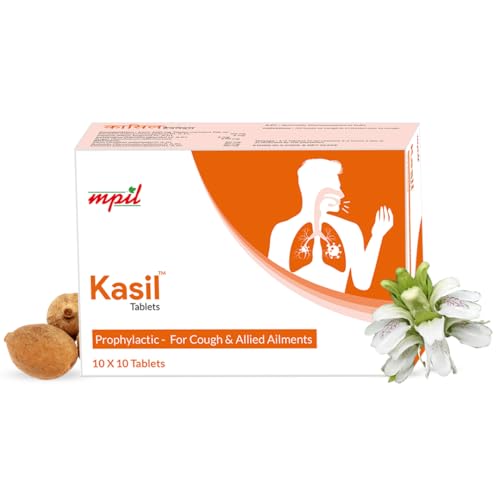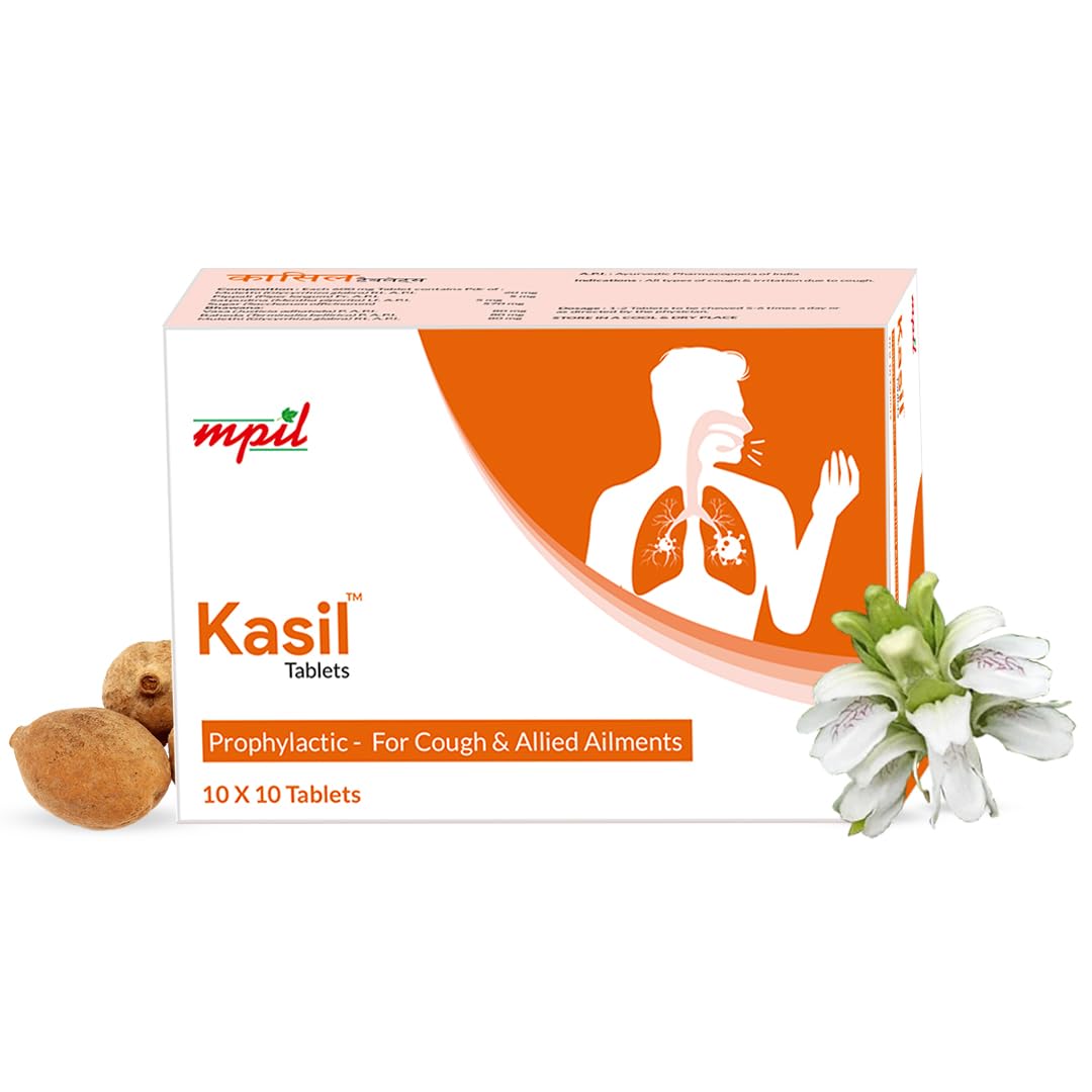 Kasil Tablets is an effective bronchodilator & antitussive. Demulcent in inflammatory and irritable conditions of the bronchial tubes.It is useful for both productive and non productive cough suitable in all seasons and seasonal coughs and is highly beneficial for drug induced cough and smoker's cough.