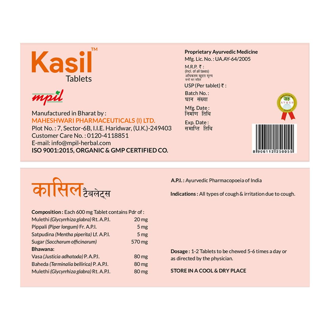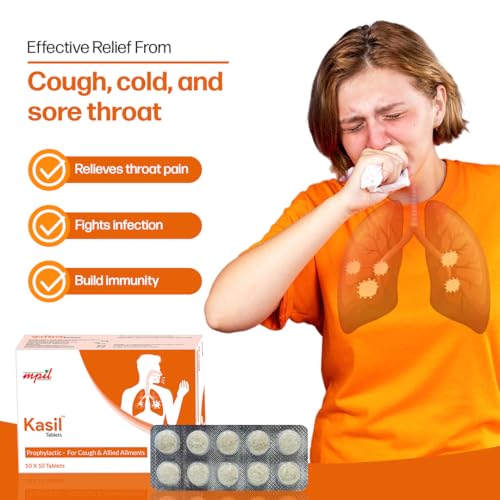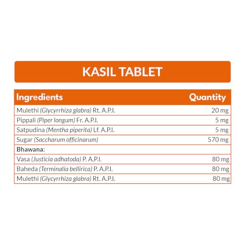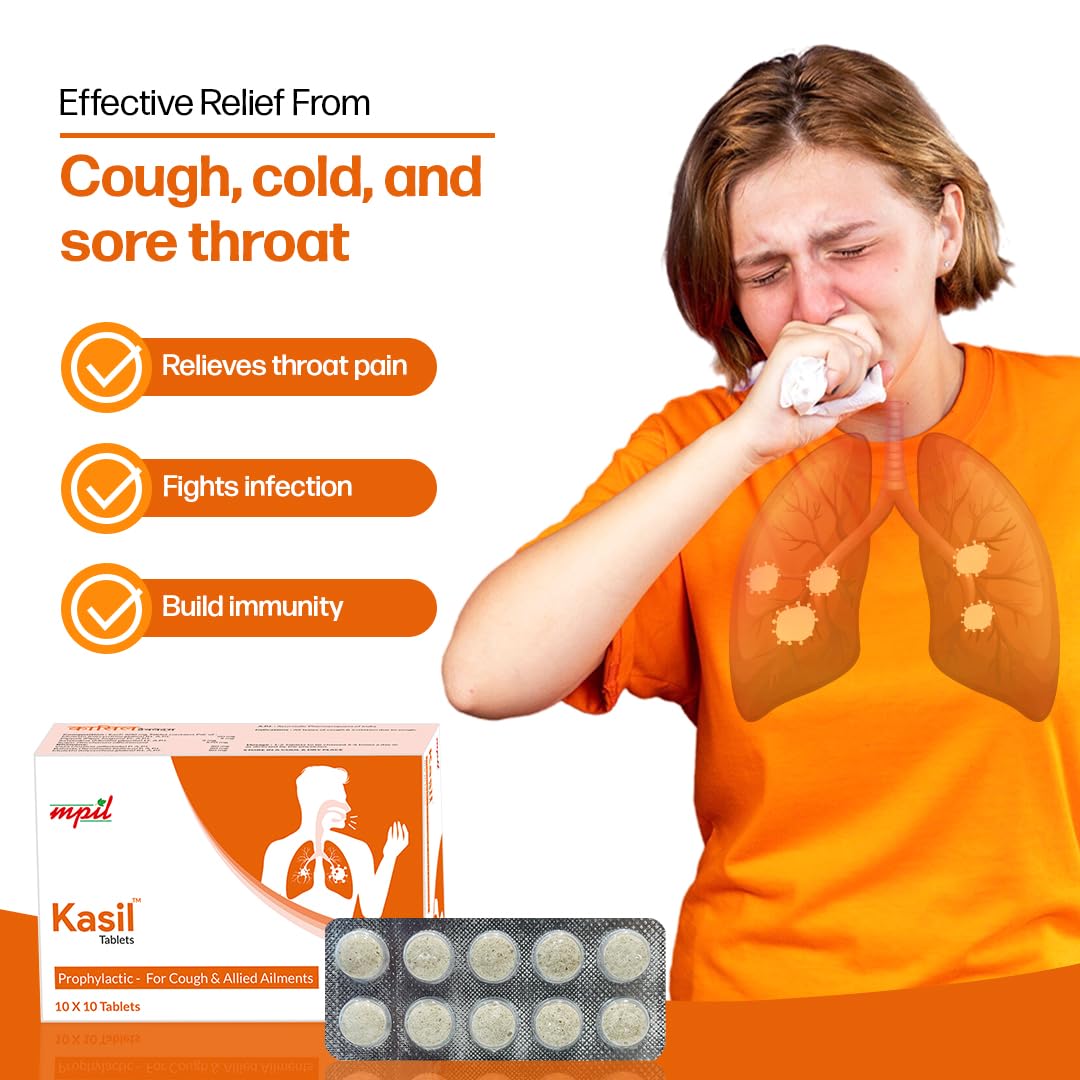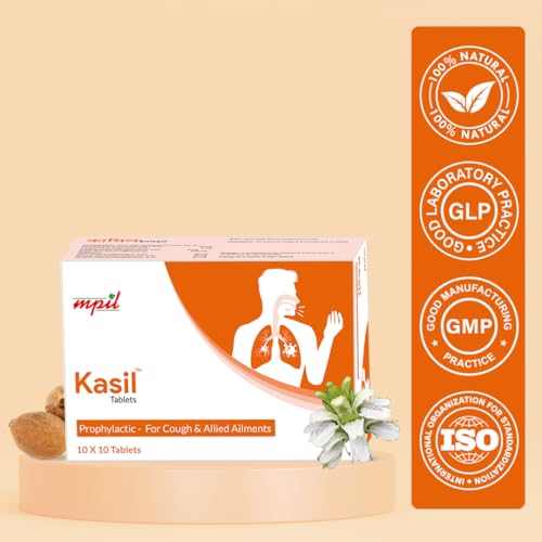 Kasil Tablets is an effective bronchodilator & antitussive. Demulcent in inflammatory and irritable conditions of the bronchial tubes.It is useful for both productive and non productive cough suitable in all seasons and seasonal coughs and is highly beneficial for drug induced cough and smoker's cough.