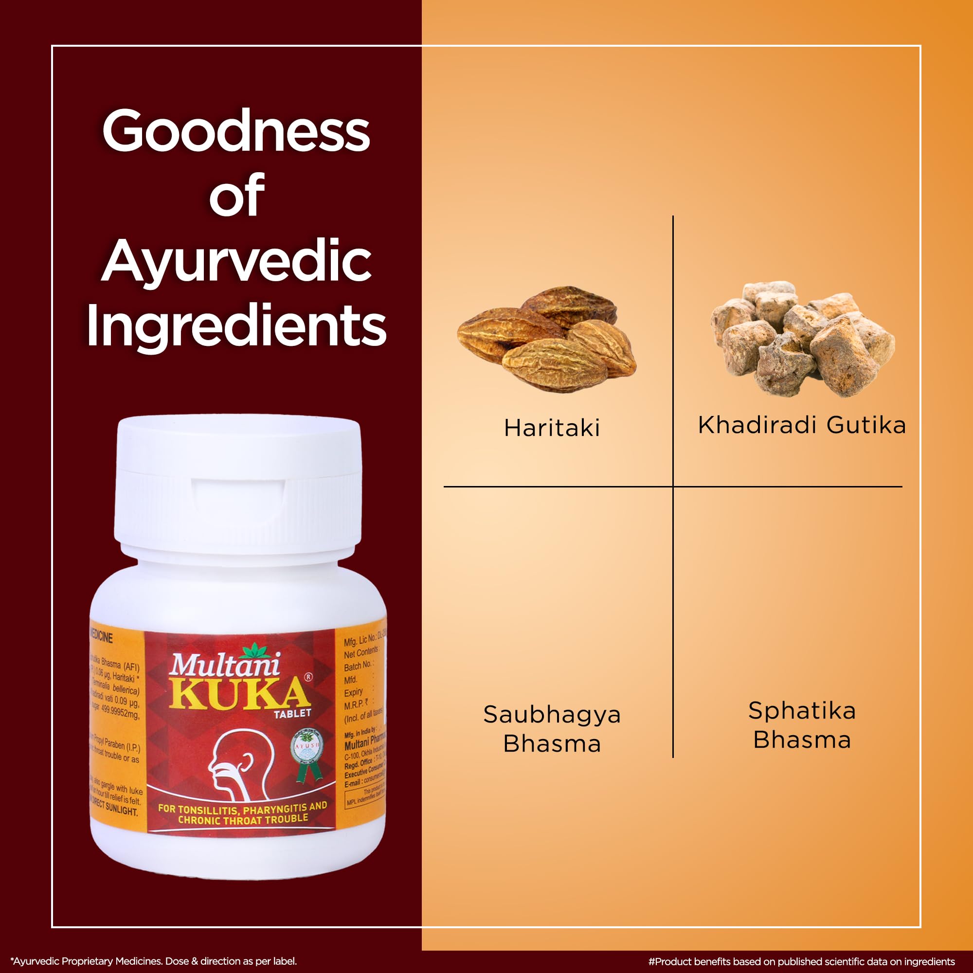 Ingredients & Benefits Saubhagya Bhasma Sphutika Bhasma Apamarg Kshar Haritaki Vibhitaki Amalakyadi Lauh Khadiradi Vati Swarn Makshik Bhasma Milk Sugar Etc. Usefull In Tonsillitis Pharyngitis & Difficulty In Swallowing Or As Directed By The Physician.