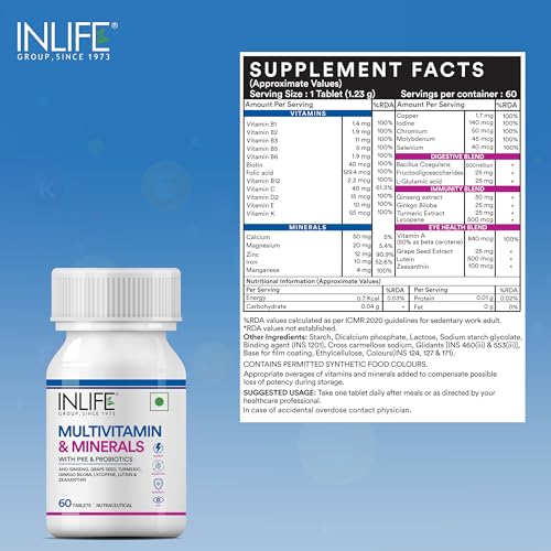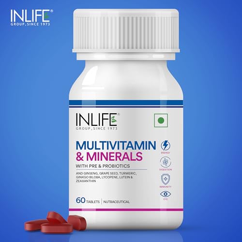 INLIFE Multivitamin Tablets For Men & Women with Ginseng & Prebiotic Probiotic | Multivitamin Supplement with Vitamin B12, C, D, E, Zinc & Biotin Nutrition Tablet - 60 Tablets (Pack of 1, 60) (Adult)