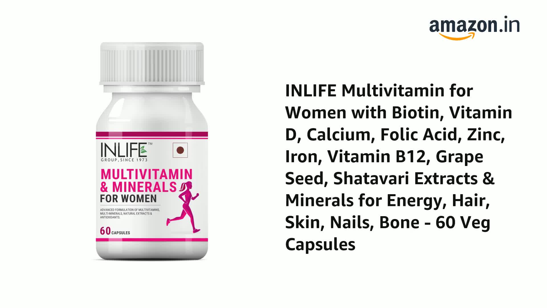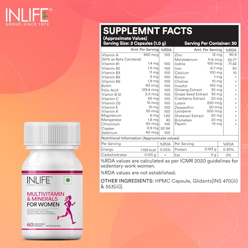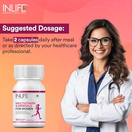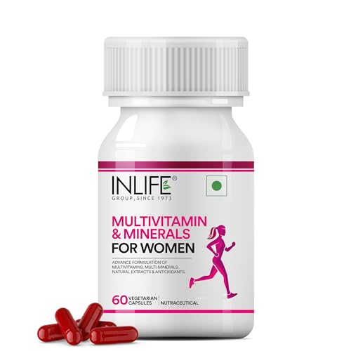 INLIFE Multivitamin & Minerals Capsules for Women provides the perfect number of vitamins minerals antioxidants specially designed for leading concerns of women. It helps to maintain a healthy body and immunity with vitamin A C E and selenium. Enrich your diet with Quality vitamins & minerals. Contains 24 essential vitamins & minerals in an advanced formula along with natural extracts of Ginseng Grape Seed Cranberry and Shatavari. Apart from this speciality ingredients it also contains Lutein Zeaxanthin Alpha Lipoic Acid and Lycopene. Offers immune support increased energy and mental alertness by providing your body with all it needs. It supports heart health bone health eye health daily energy and immune health. Our blend of nutrient diverse women's vitamin and minerals formula is believed to support nutritional balance and helps convert food into energy. Complete pure vitamins and mineral combination with size â¬Ë0' capsule means easy to swallow. 1-month supply of 60 capsules made according to the GMP standards. As a dietary supplement take two (2) capsules together once a day after breakfast with a full glass of water or as directed by your healthcare professional. For those with a more sensitive constitution we recommend taking one (1) capsule twice per after meal with a full glass of water. Consider ordering one bottle for yourself and another for a friend or loved one. Keep each other motivated and reach your goals together and more quickly. INLIFE Healthcare stands by every quality product they make. We manufacture only premium and extra pure but high potency vitamins capsules tablets powders multivitamins herbal supplements and natural herbal skin & personal care products for men women and children. Check INLIFE Healthcare out today!