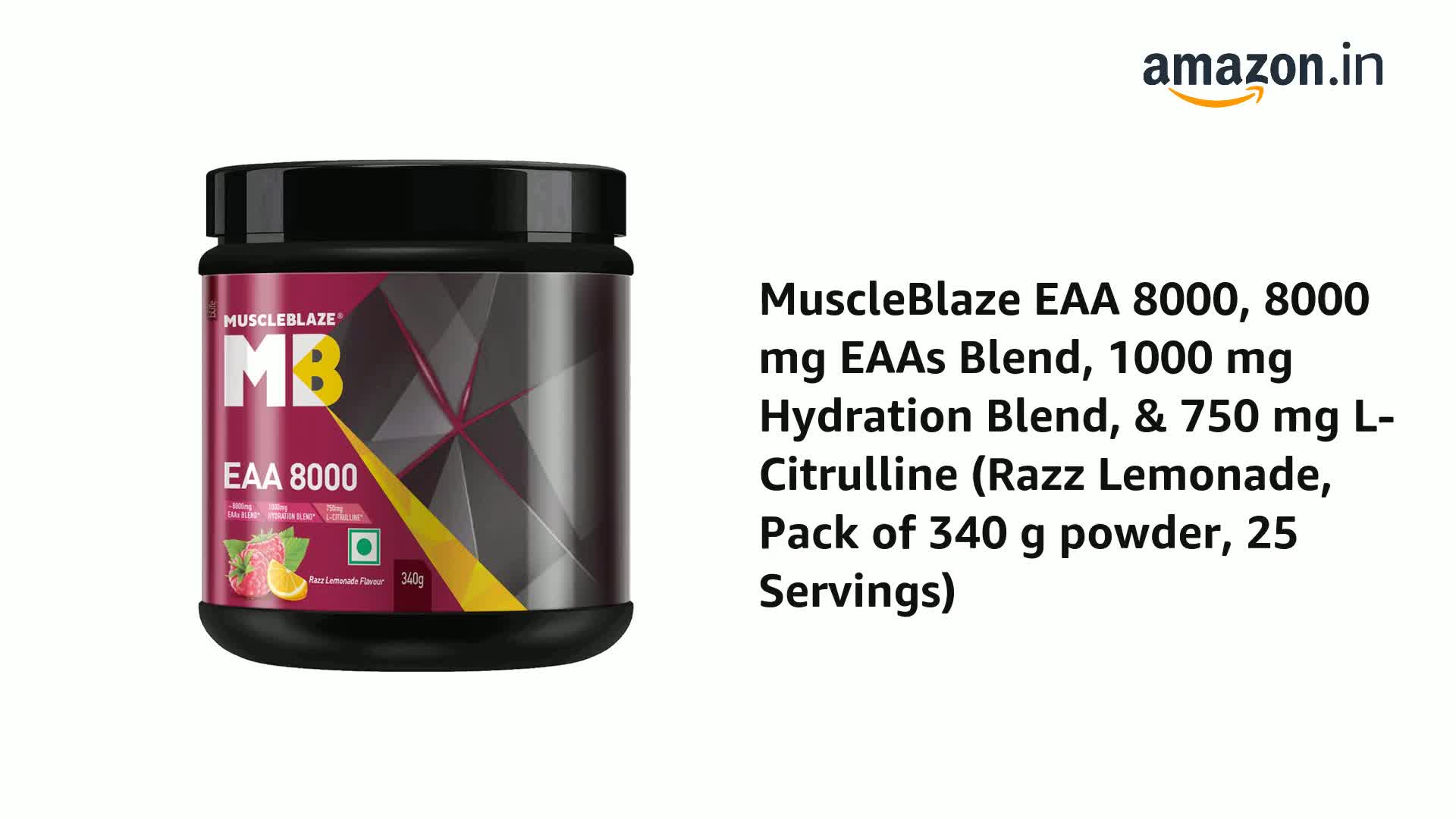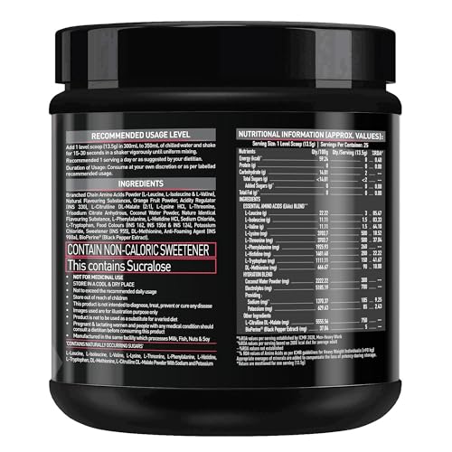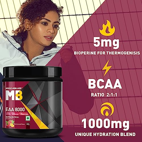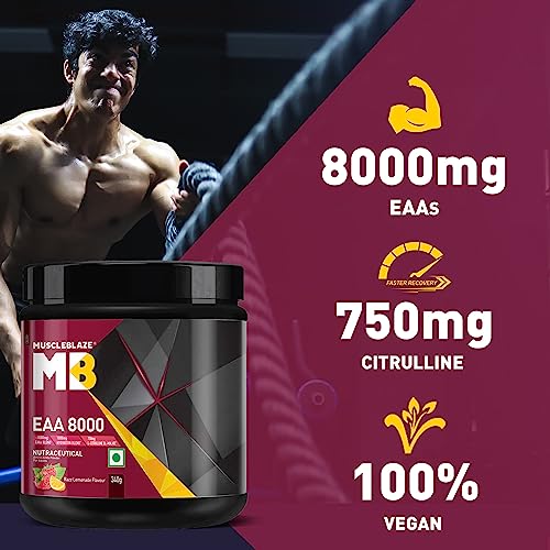 Fast muscle recovery is one of the most important aspects of bodybuilding as it helps you stay on track and keep achieving new fitness milestones faster as compared to the long recovery time in-between the exercises. Along with ample rest and a good workout routine your body also needs great nutritional support that can help you power through each workout session. Get good muscle pumps instant energy stamina and strength with the power of 9 Essential Amino Acids in MuscleBlaze EAA 8000 the best EAA supplement on the market. Essential Amino Acids are among the most widely used supplements as they are easily absorbed and give your body the fuel that it needs to perform at its best abilities each time. MuscleBlaze EAA 8000 intra workout supplement is formulated especially keeping the constitution of your muscles in mind to support faster recovery. This vegan intra workout supplement for men and women provides 8 g of EAAs comprising BCAAs (Leucine Isoleucine & Valine) in a ratio of 2:1:1 in each serving. The unique hydration blend keeps you hydrated and energized for longer workouts. This EAA BCAA supplement is enriched with Citrulline & Bioperine which help in enhanced pumps and absorption of nutrients respectively. It has no added sugar or trans fat & contains immunity boosters Zinc and Vitamin C. Enjoy it in two refreshing flavours - Razz Lemonade Blue Cola & Melon Martini.