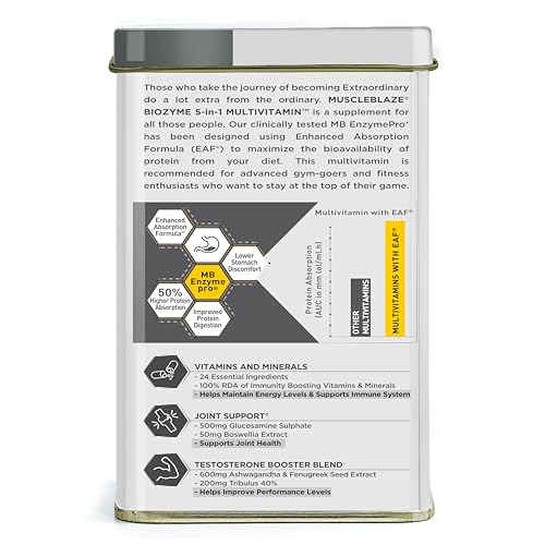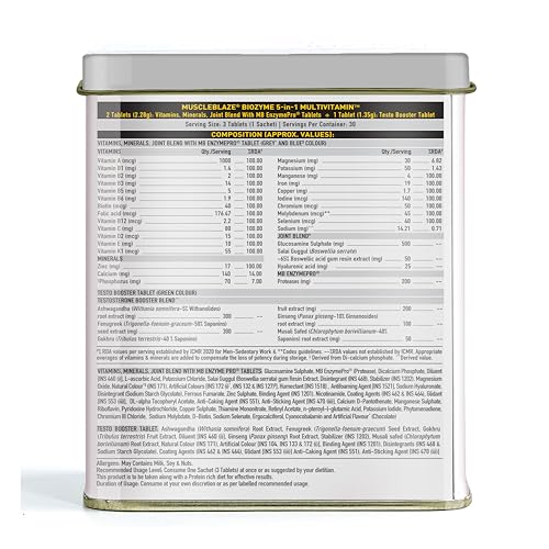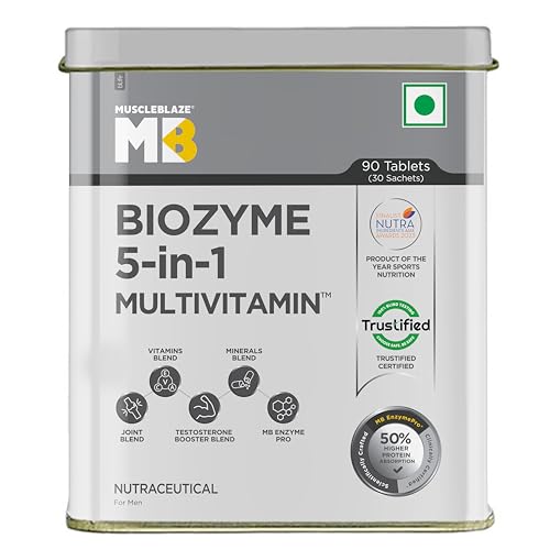 • JOINT BLEND: When you are an advanced gym-goer you have no room for joint discomfort pain or inflammation. MuscleBlaze Biozyme Daily Multivitamin for Men contains a joint blend that assists in mobility flexibility and upkeeps the health of your joints