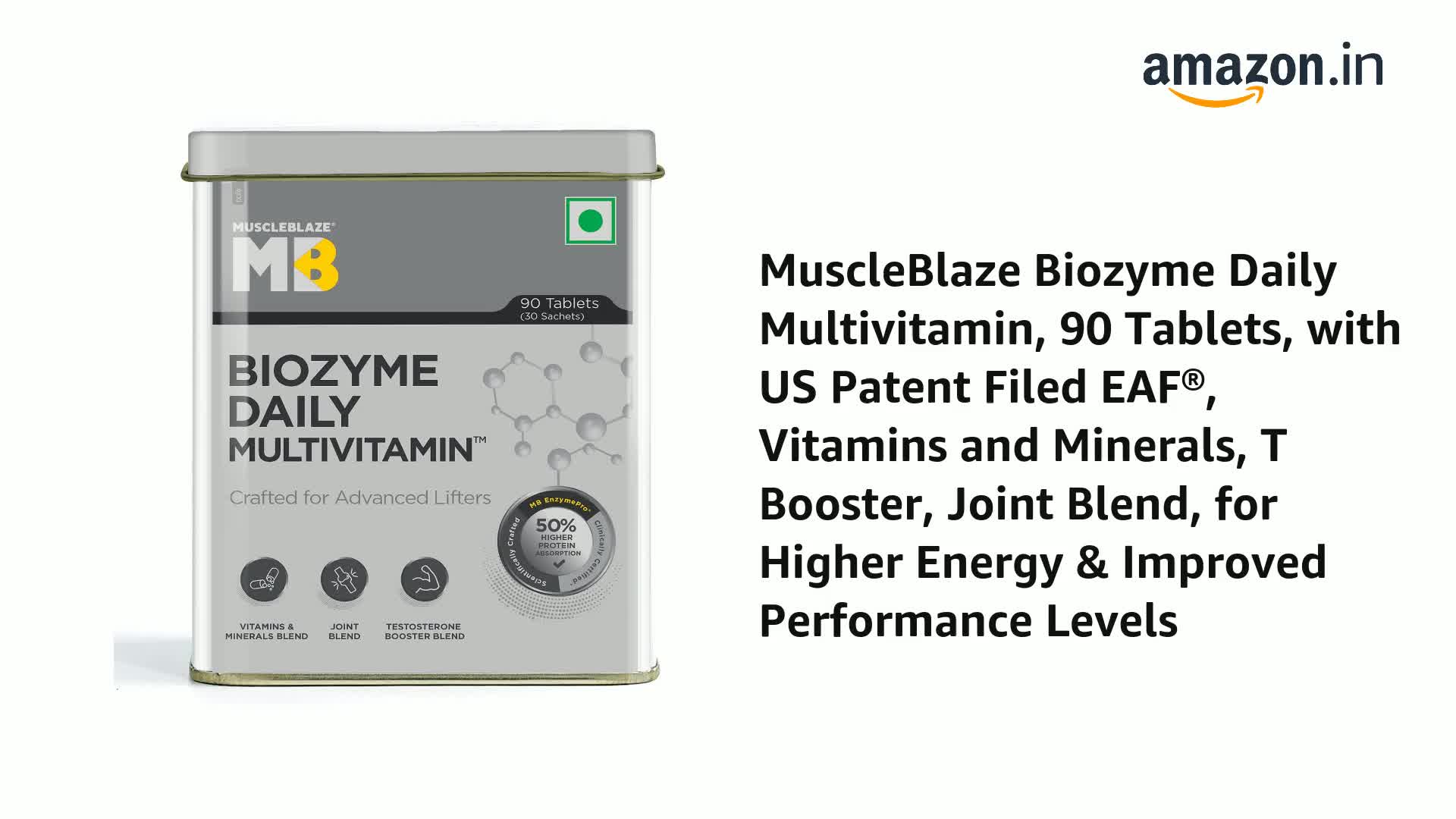 • POWER OF BIOZYME: MuscleBlaze Biozyme Daily Multivitamin is more than just a multivitamin with our proprietary and clinically tested MB EnzymePro that has Enhanced Absorption Formula (EAF) to ensure 50% higher protein absorption and keep stomach issues mi