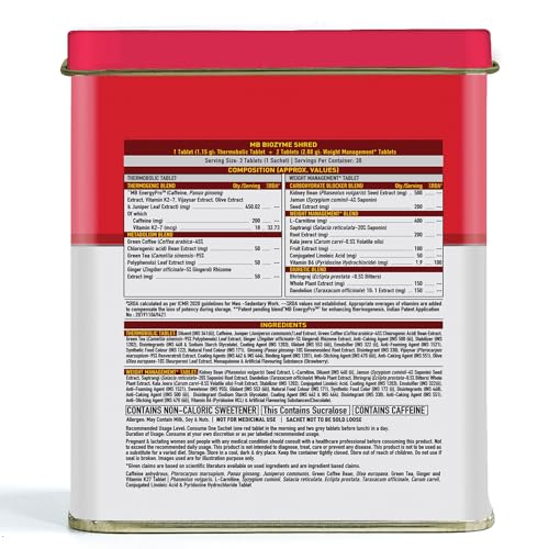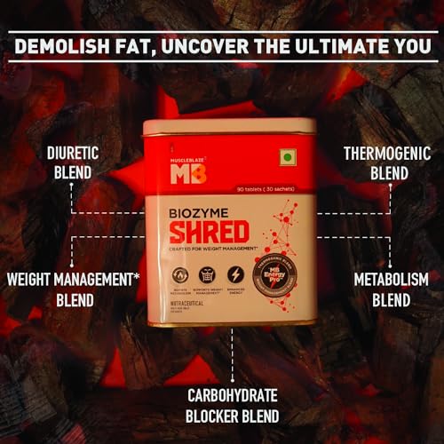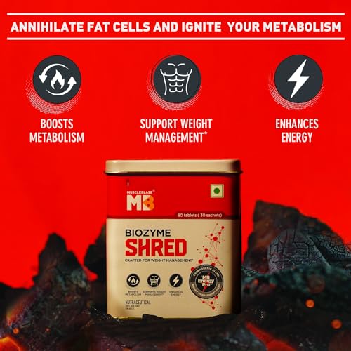 • THE METABOLISM IGNITOR: When metabolism slacks off it paves the way for unwanted weight gain. With MuscleBlaze Biozyme Shred you can unlock the power of your metabolism and ignite your weight management journey. Its Red Thermobolic Tablet offers powerful