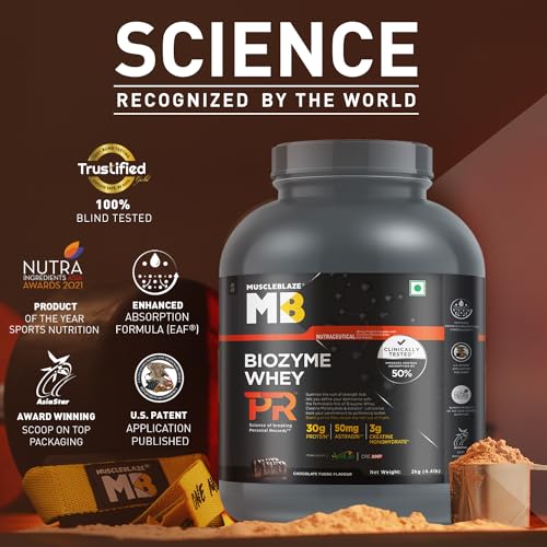 • 30g PROTEIN 3g CREATINE MONOHYDRATE & 50mg ASTRAGIN: MuscleBlaze Biozyme Whey PR delivers all this per scoop powered by all-imported highest grade international quality Isolate & concentrate whey protein blend. Powerful trio lets you perform better & help