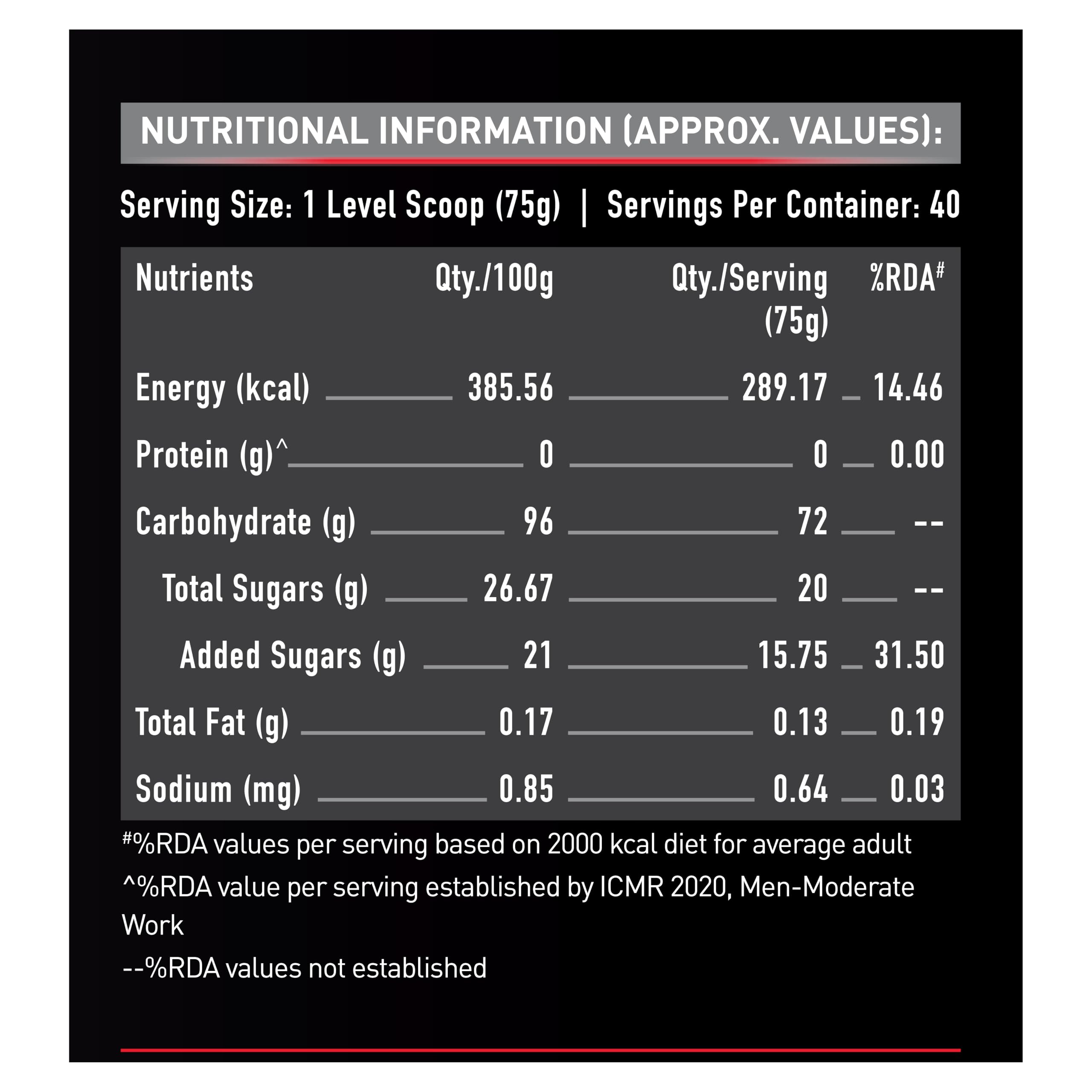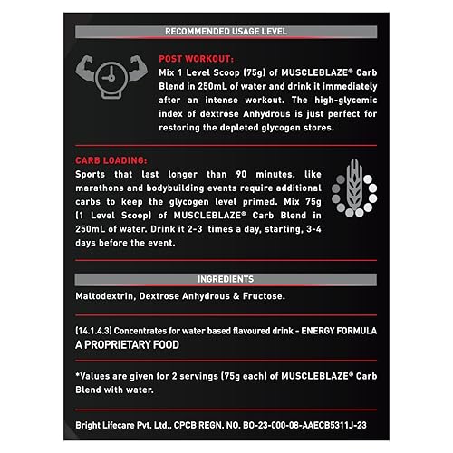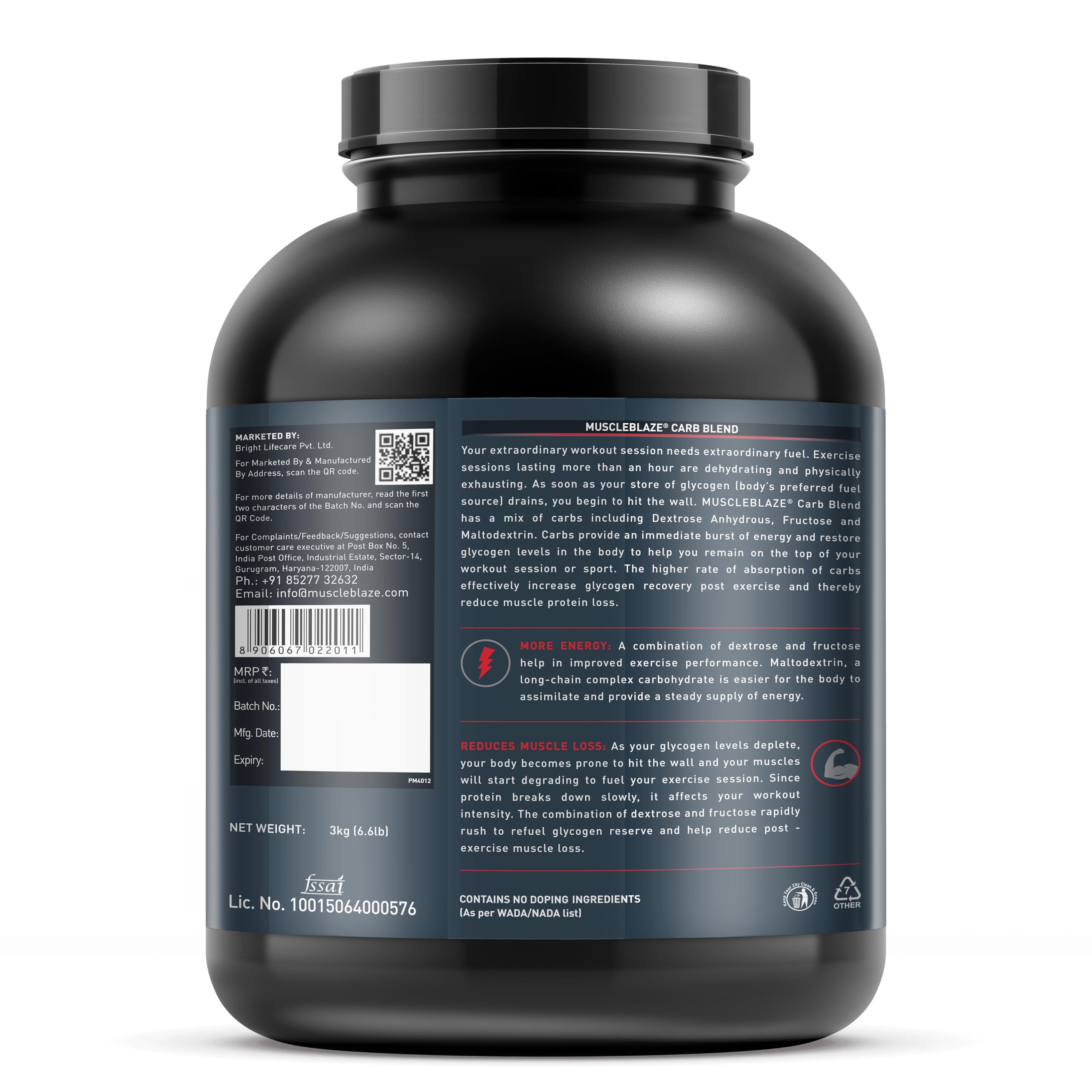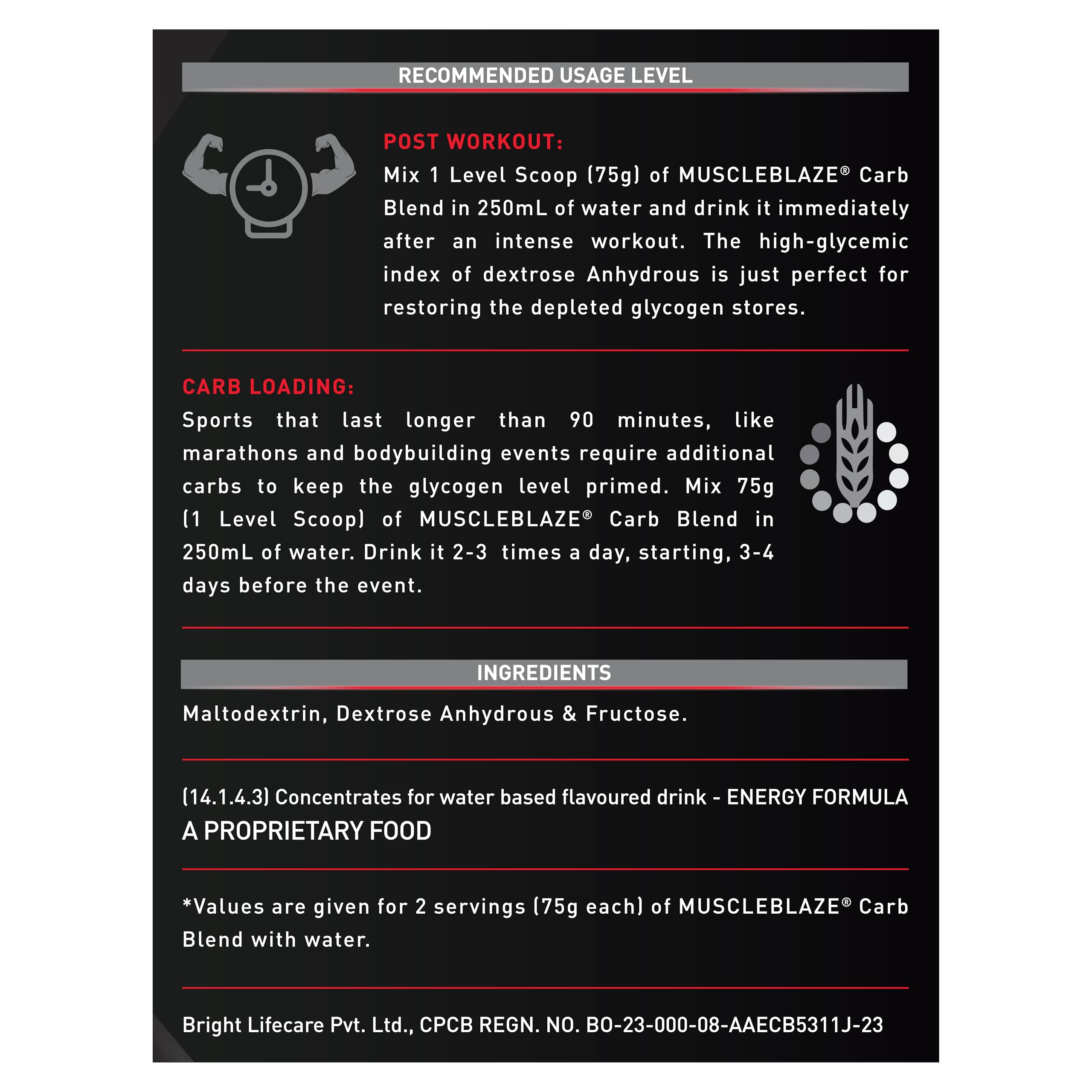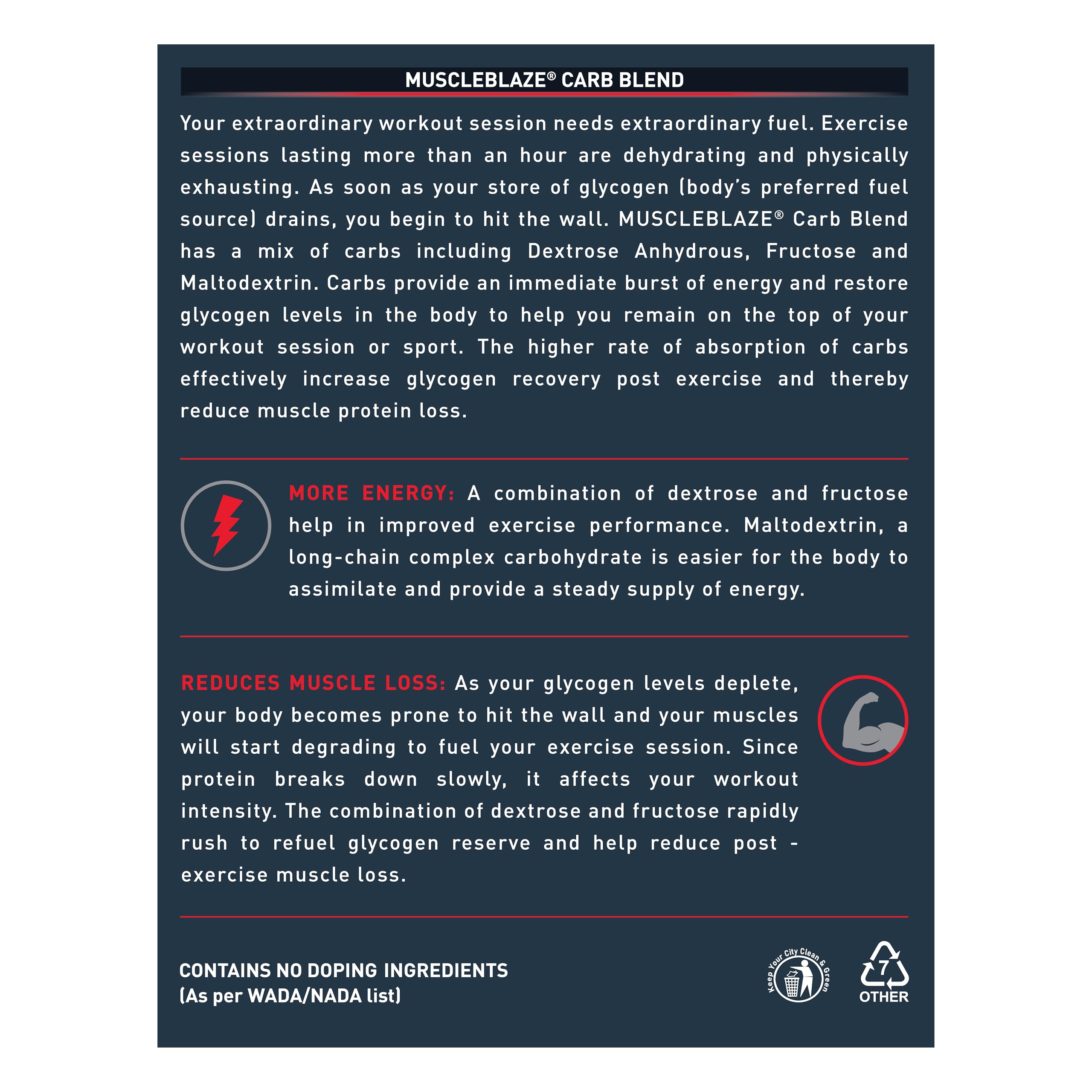 MuscleBlaze Carb Blend is a superior mix of carbs such as dextrose fructose (fruit sugar) and Maltodextrin a starch derivative. MuscleBlaze Carb Blend absorbs quickly and provides immediate as well as sustained energy during intense physical activities. The energy burst provided by MuscleBlaze Carb Blend makes is a perfect recovery drink for athletes and runners and helps them to avoid hitting the wall a condition attained by complete depletion of glycogen (longer chain version of glucose stored in the muscle cells and the liver). Easy to mix MuscleBlaze Carb Blend can be had in-between the marathon run to keep the energy level brimming. Post workout MuscleBlaze Carb Blend helps create an insulin spike that assists in new muscle synthesis.